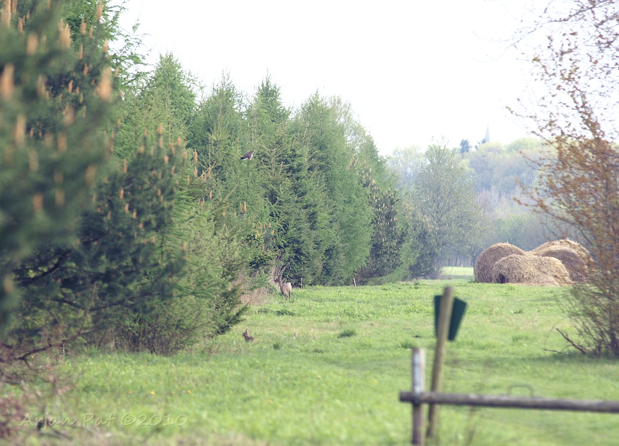 Niet de mooiste foto, maar wel even een apart moment: Ree, konijn en buizerd in 1 blik gevangen. (Zal de buizerd het konijn zien en een poging wagen?)