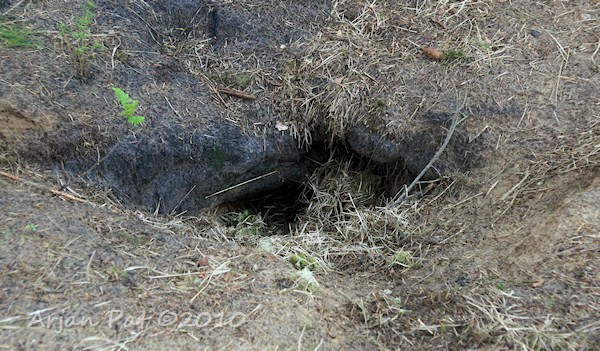 De dassenburcht, die ik een paar maand eerder ontdekte, was wel degelijk bewoond, want er was weer een nieuwe ingang gemaakt. Er lag een hoop vers opgegraven zand om de ingang. Ook in en om de ingang lag allemaal vers nestmateriaal van gedroogde bentepollen uit een nabij gelegen vennetje.