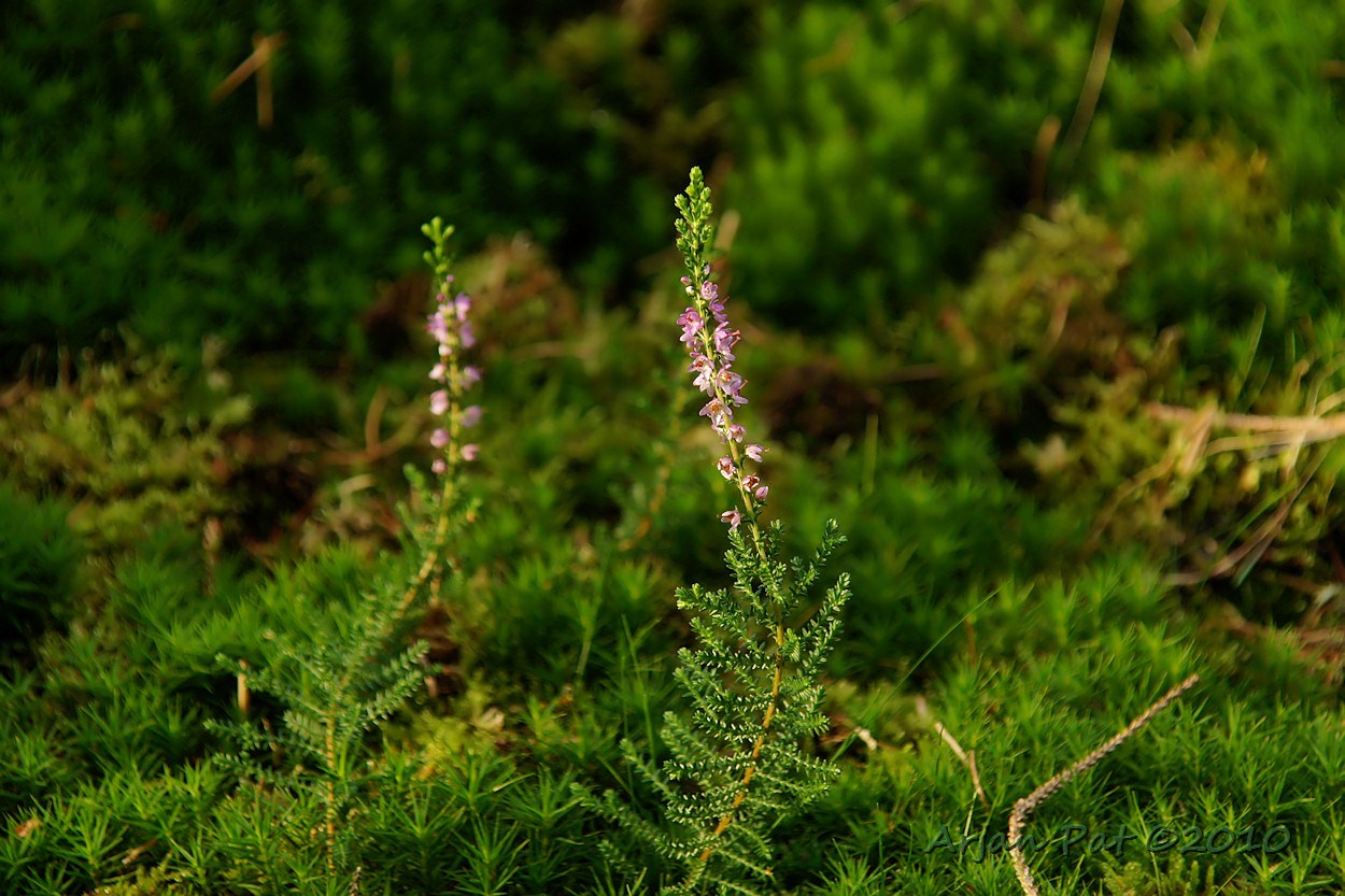 Paar verdwaalde heideplantjes midden in het bos.