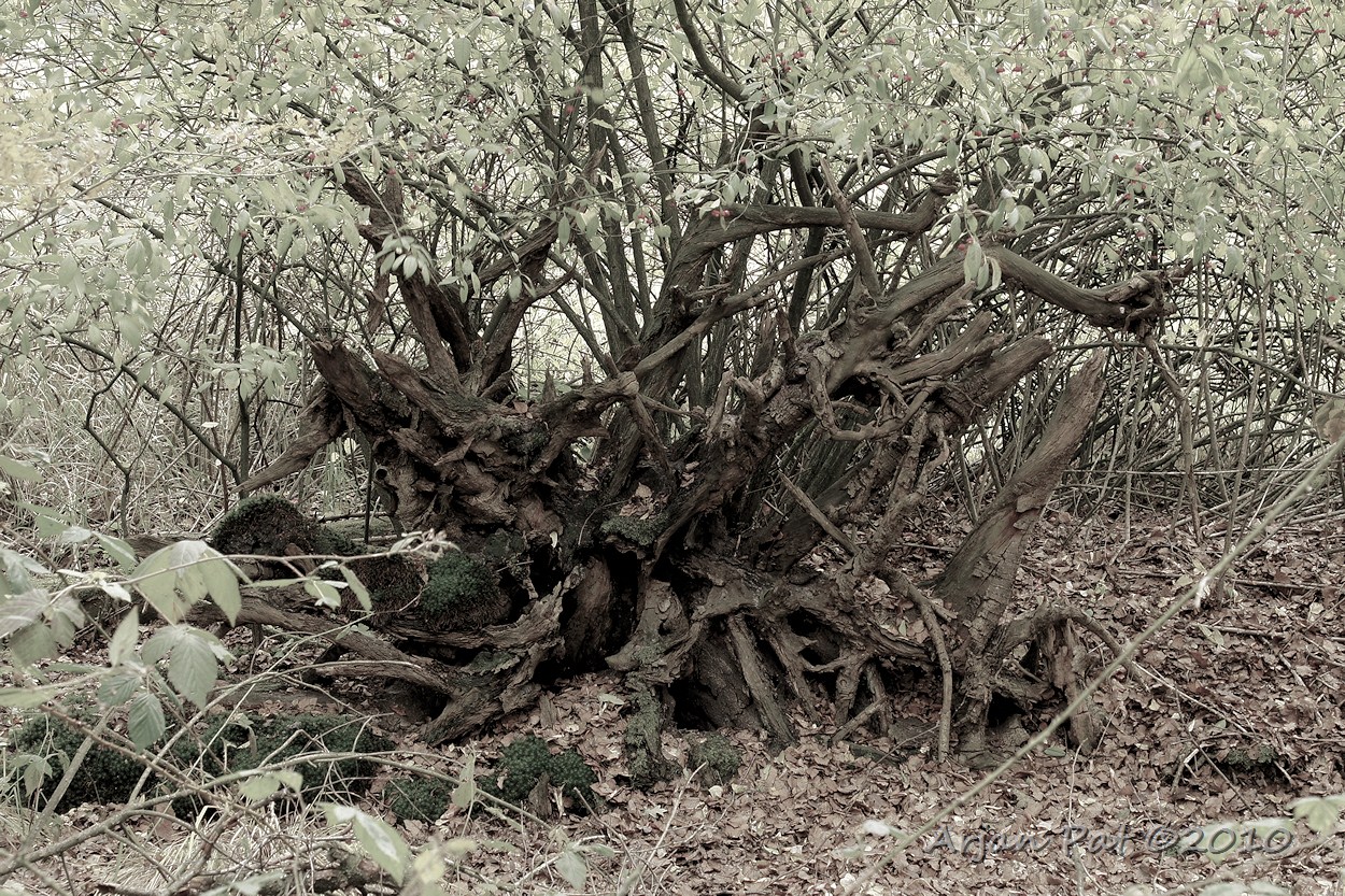 Oude knoestige struik met rode bessen of toch de wortels van een omgewaaide boom met vlak daarachter een bessenstruik?