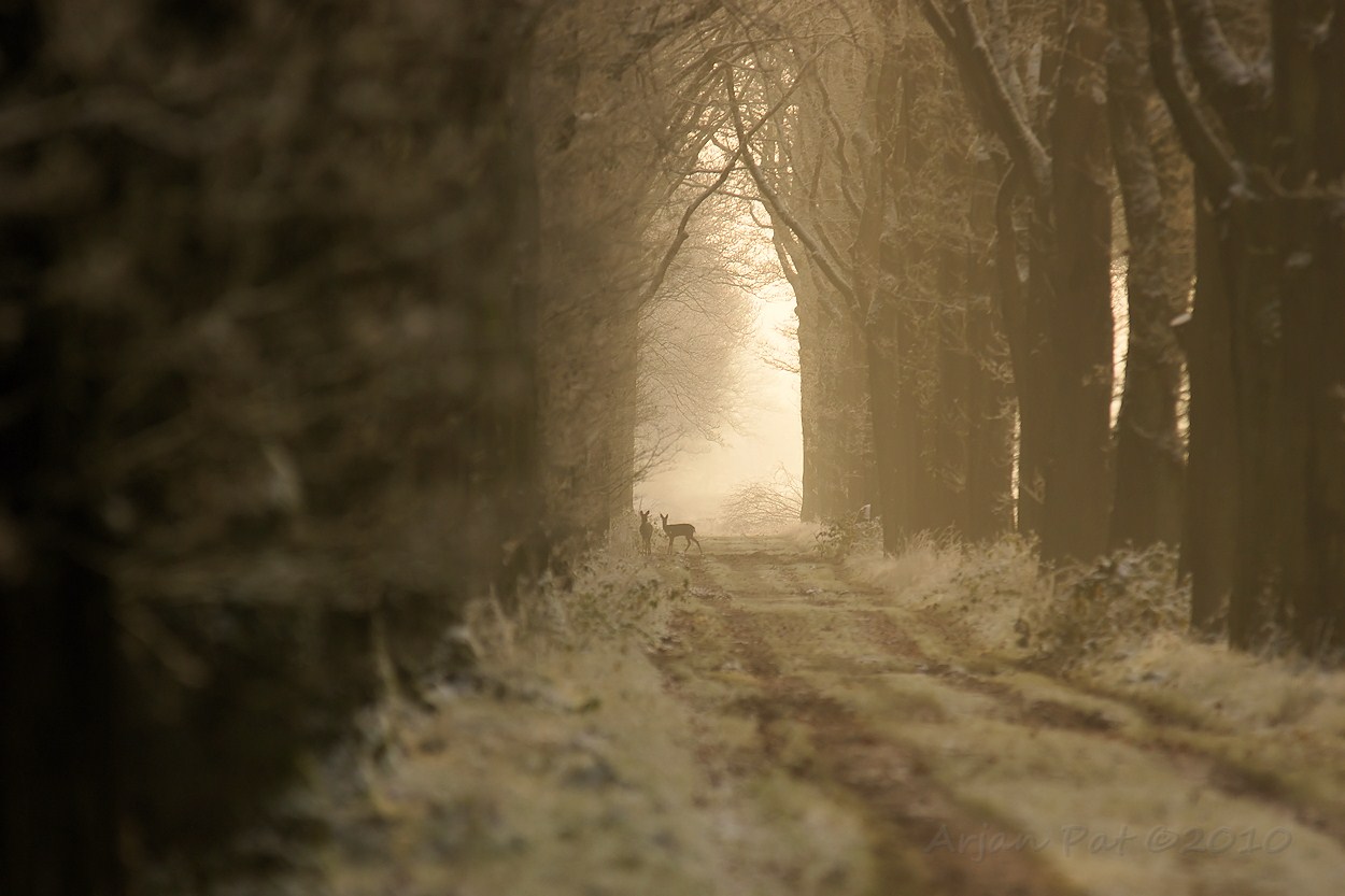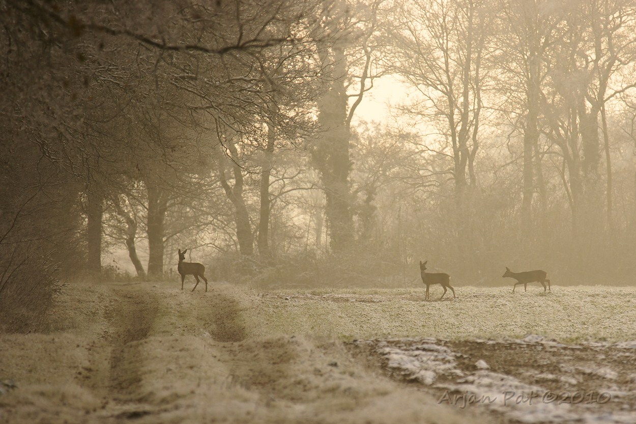 Heel in de verte staken 3 andere reeën een weiland over. Ik kwam in een hoek van 90 graden aangelopen en kon ze toch nog redelijk dicht benaderen, voordat ze het bos inschoten. Het was best een mooi gezicht zo tegen de zon in.