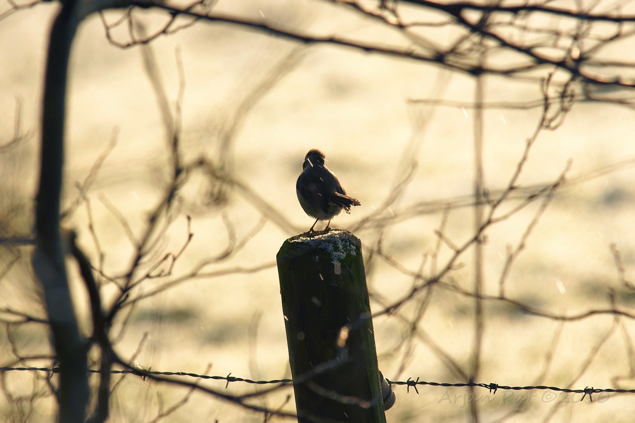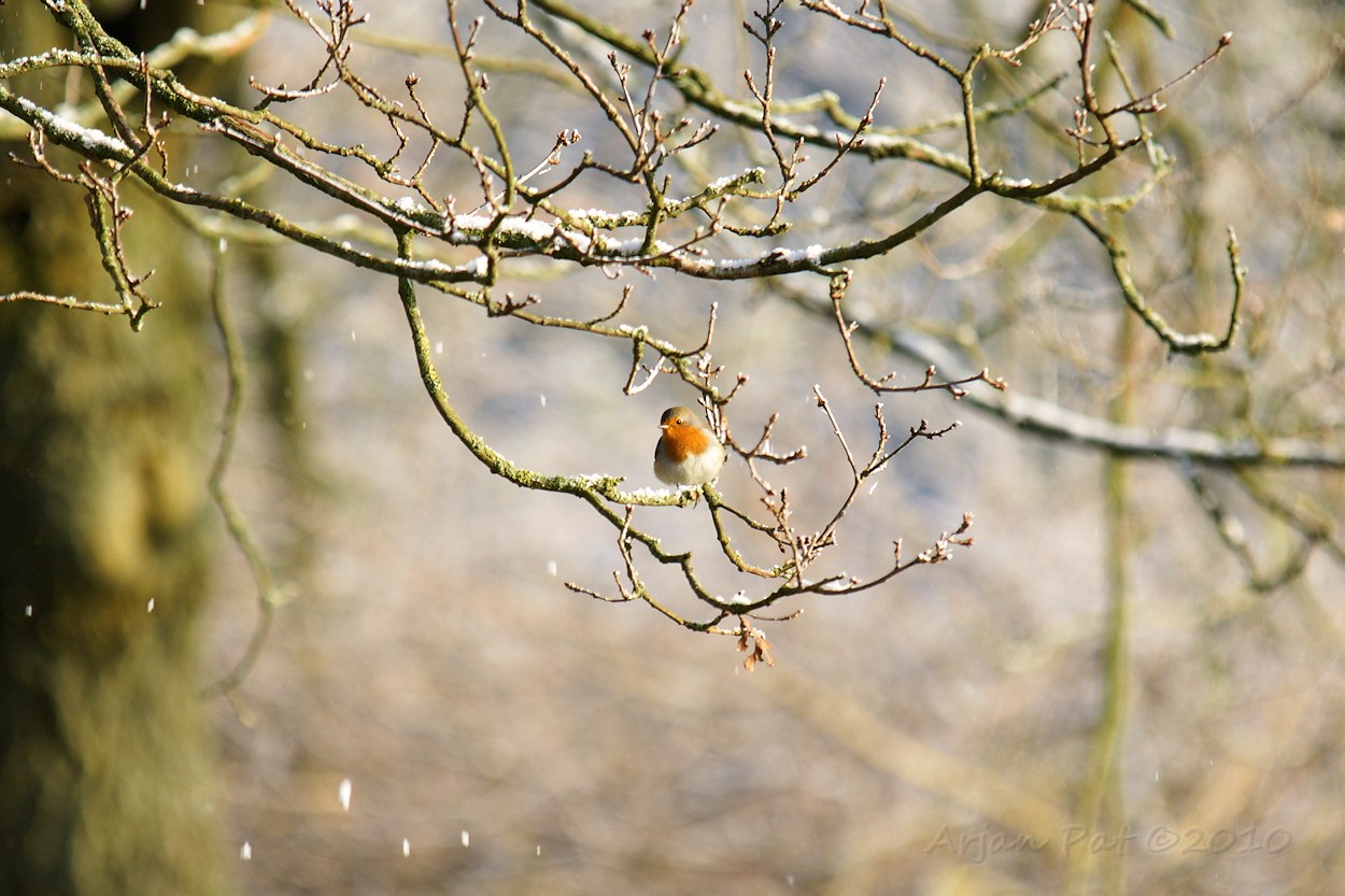 Dit Roodborstje kreeg wat vallend rijp op zijn knarretje.