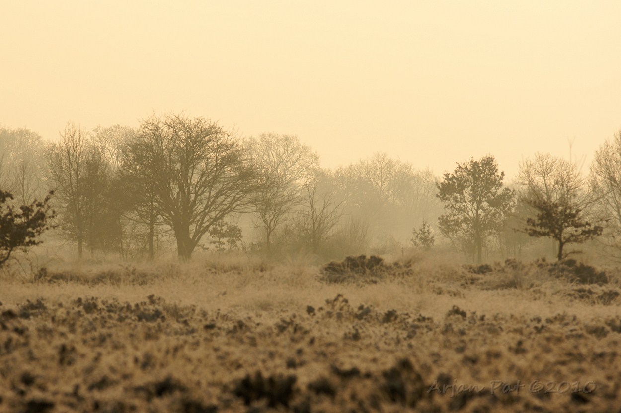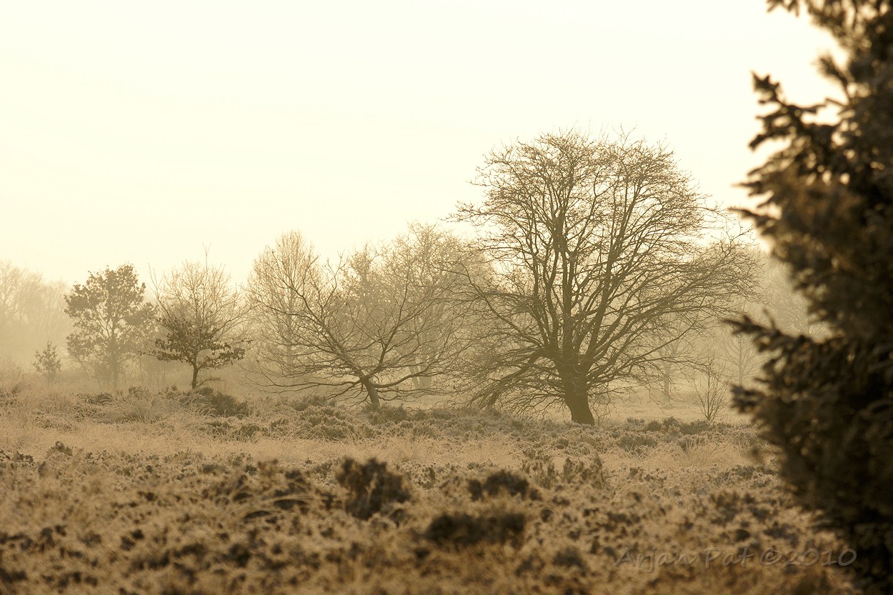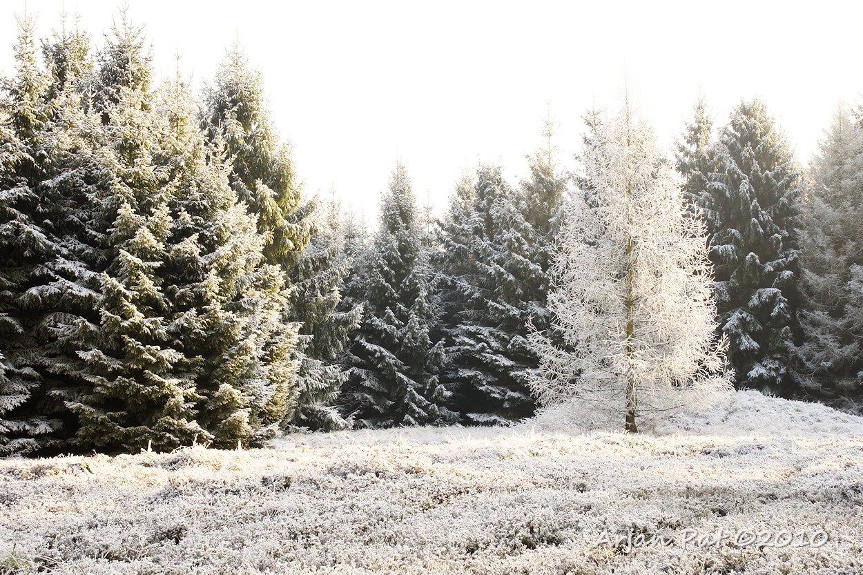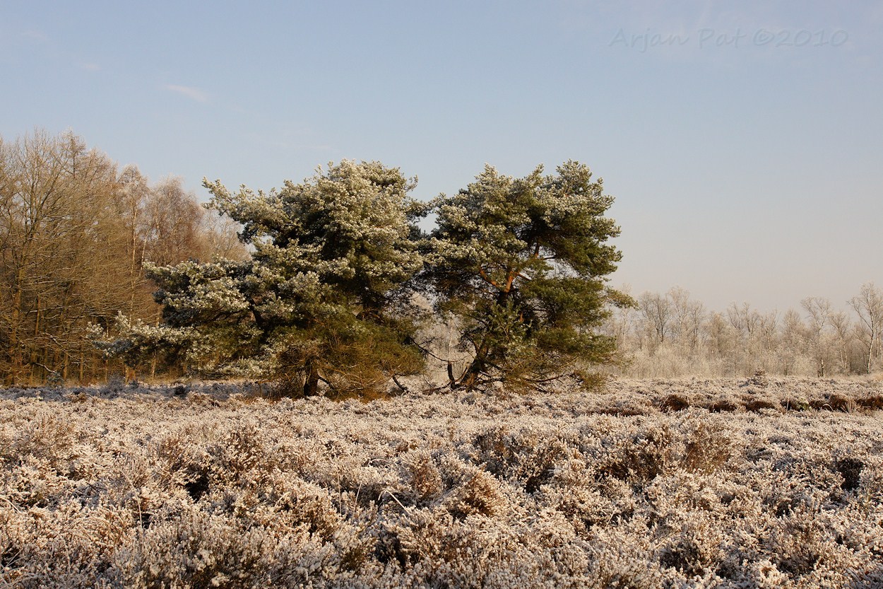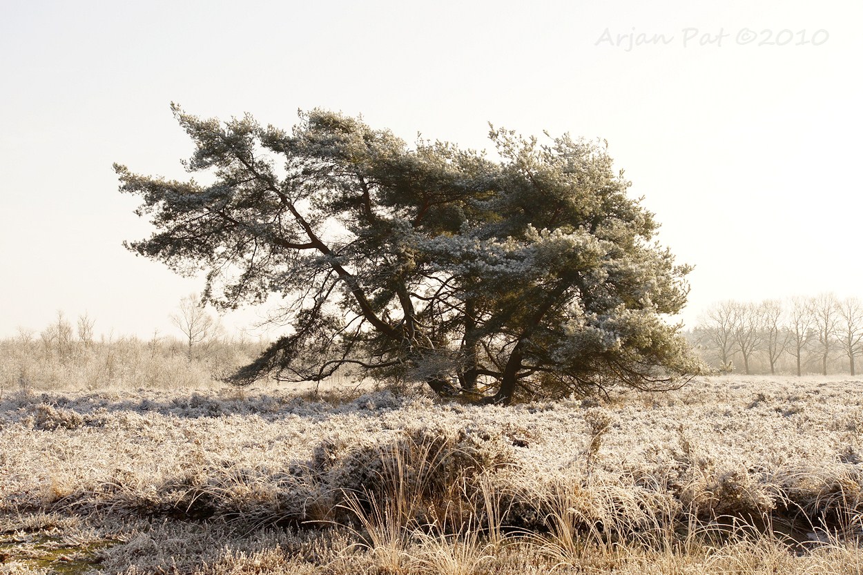 Er staan heel wat raar gevormde naaldbomen op de heide. Met al die wittigheid zie je het pas goed.