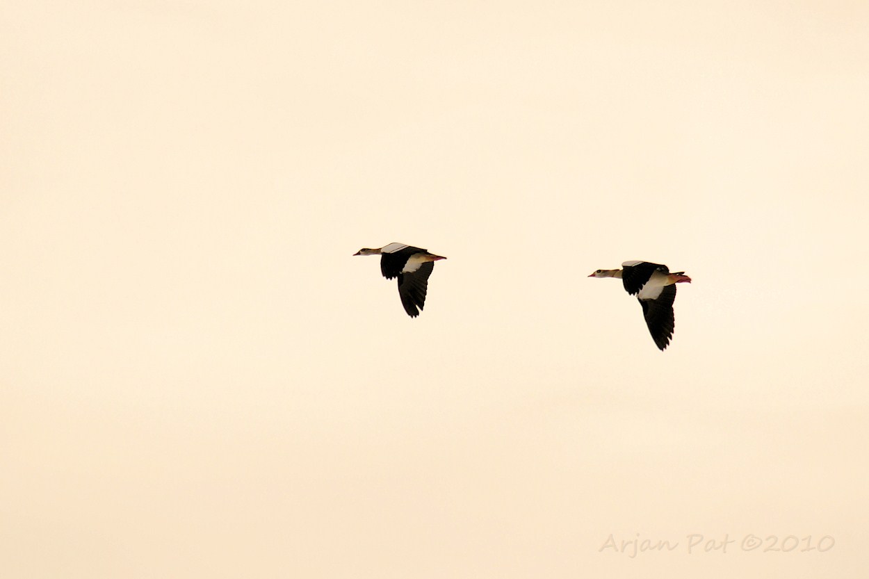nijlganzen vlogen voorbij op het moment, dat de zon zich achter de wolken wou gaan verschuilen. De wolken weerkaatsten het zonlicht in diverse geeloranje kleuren.