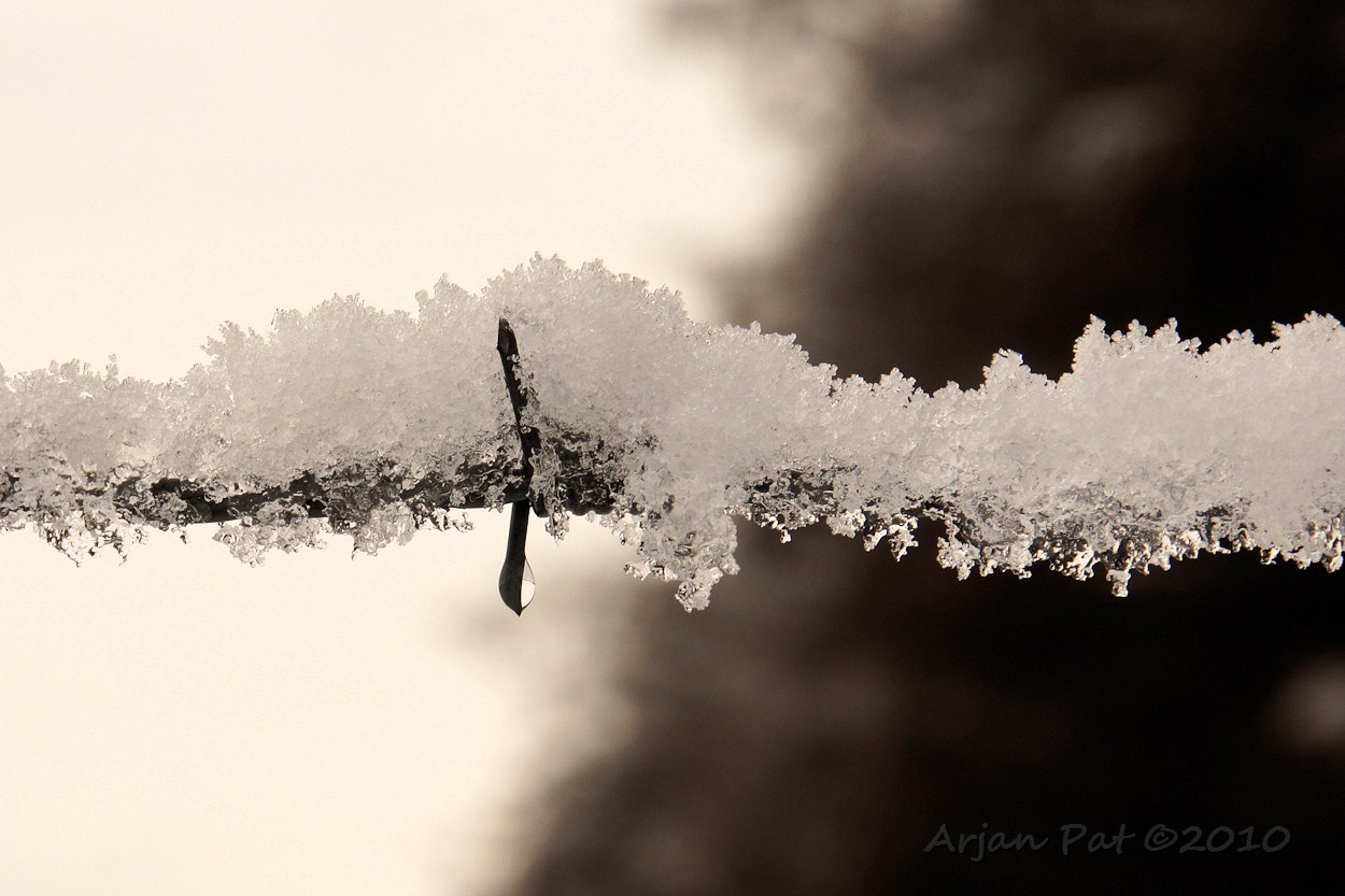 Een paar week geleden had ik ook al prikkeldraad gefotografeerd, waarop rijp aanwezig was. Vandaag geen rijp, maar (smeltende) sneeuw.