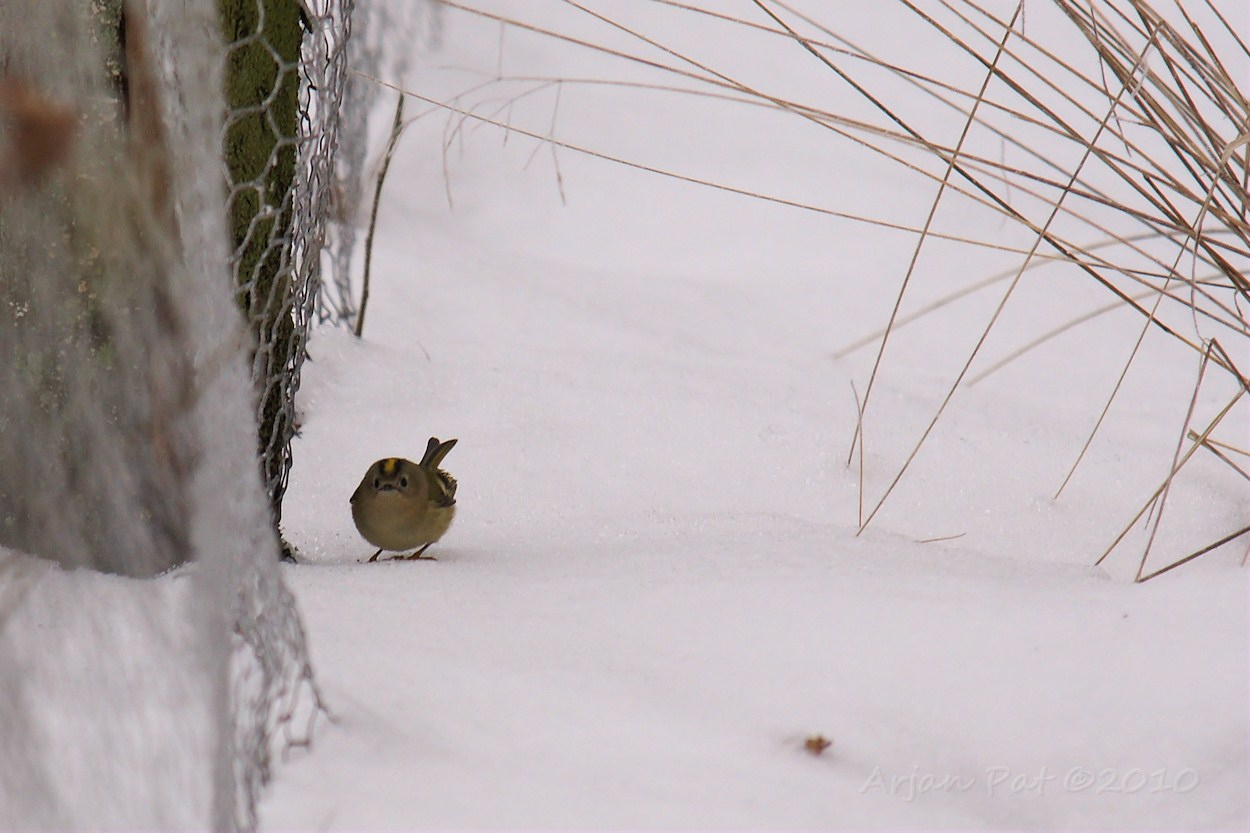 Goudhaantje lijkt zich af te vragen: 'Hoe kom ik hier nu langs?'