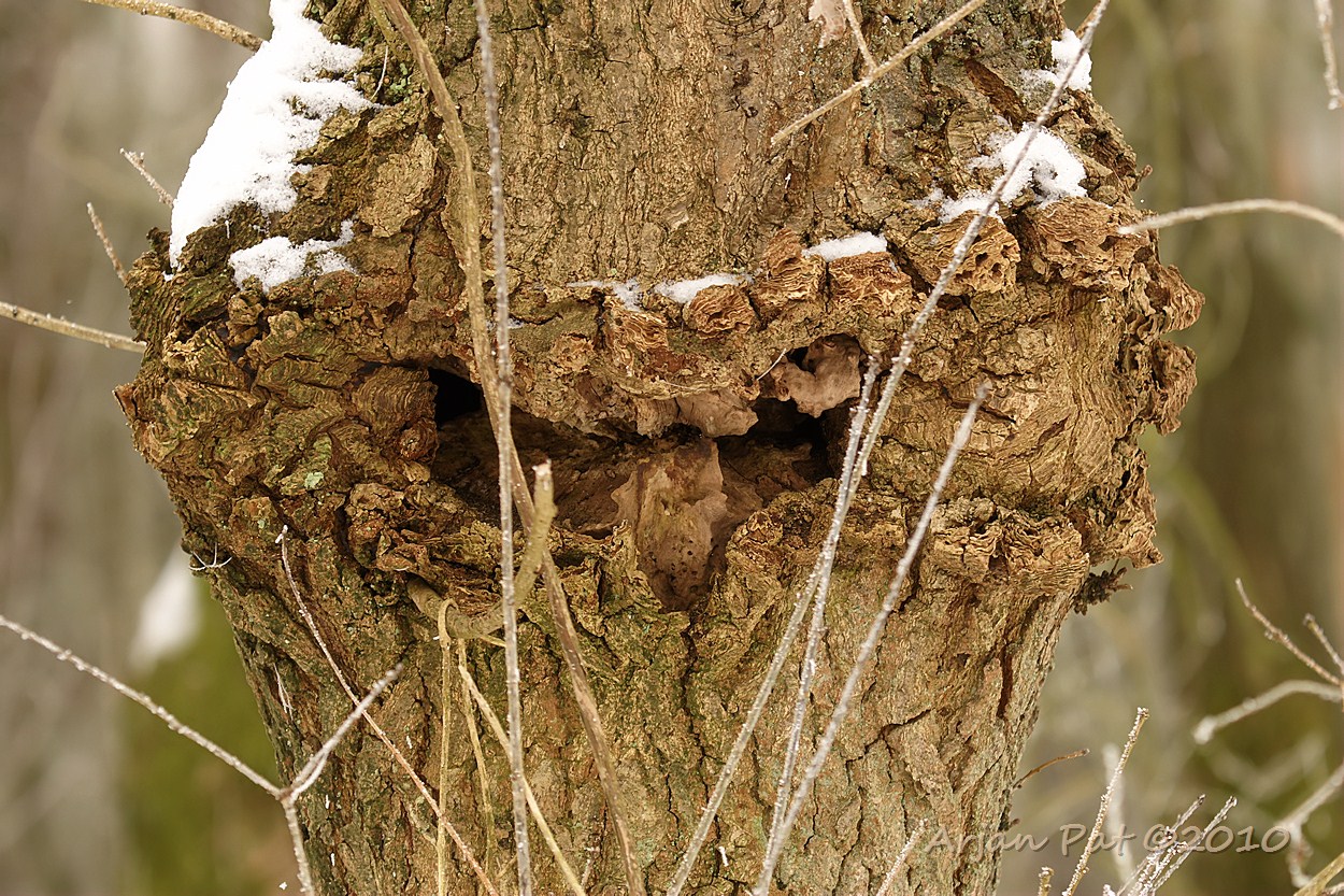 Zie je ook, dat er een drietal dennenappels klem zit in de boomholte?