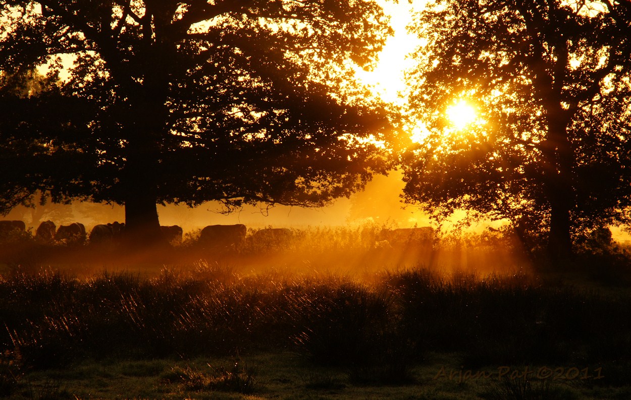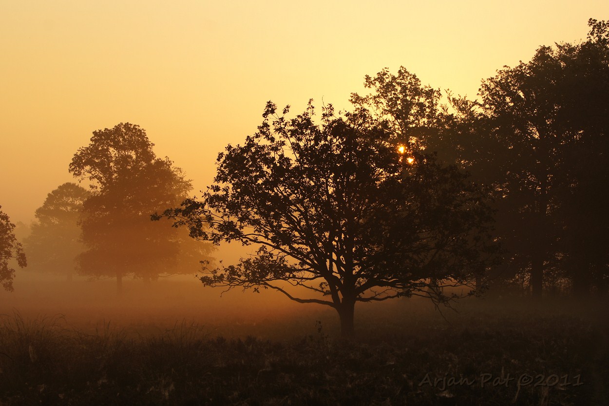 Wandeling op en rond Boswachterij Odoorn, met o.a. bomen bij een mistige zonsopkomst en reeën.