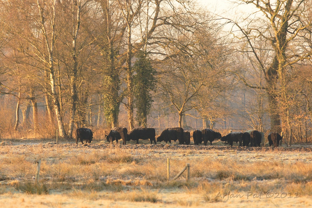Het is zo koud, dat zelf de rijp bij deze koeien op de rug aanslaat.