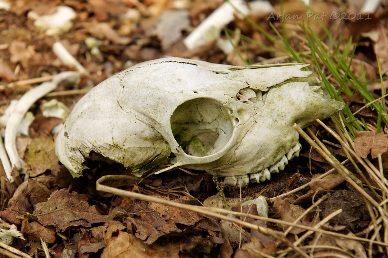 Net even van het bospad af lag 'iets' wits. Nader onderzoek wees uit dat het hier gaat om een een dode ree. Zij mistte een stukje uit de schedel (rechts achter). Ging het hier om een brute moord?