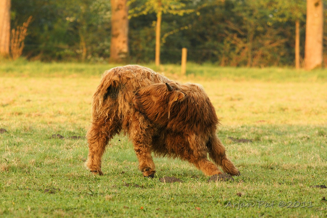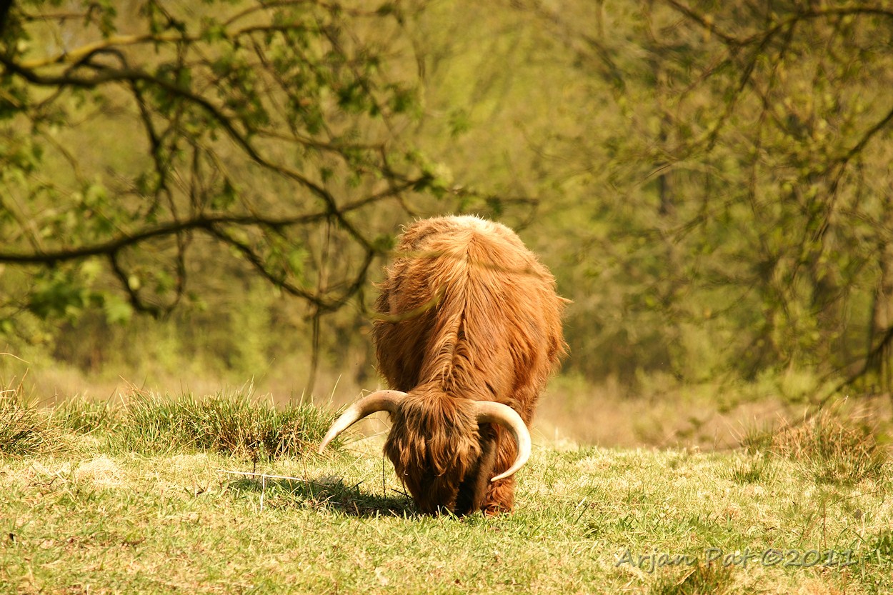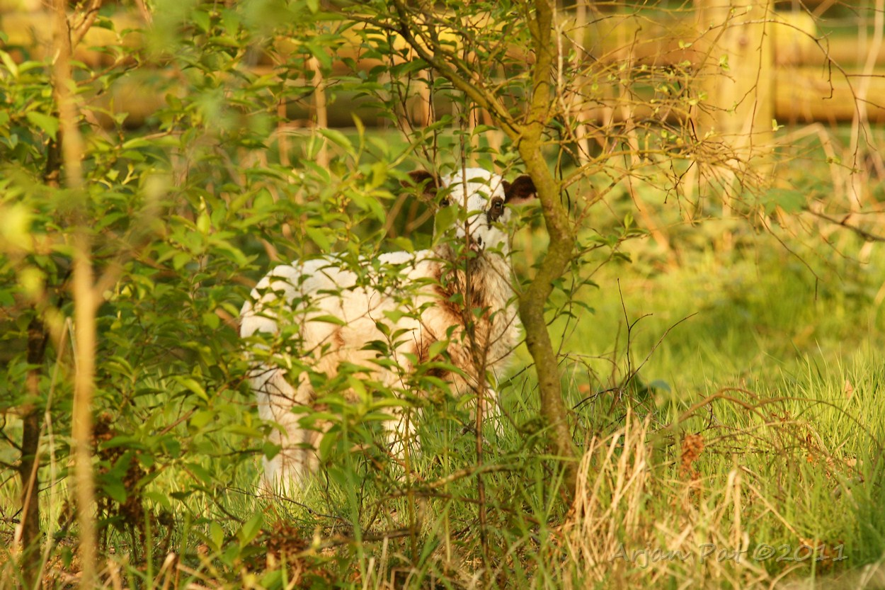Warempel, het is dezelfde als vanmorgen. Zou ie niet terug kunnen naar de kudde, die zo'n 30 meter verderop, aan de andere kant van het hek, aan het grazen was? Ach als ie wil kan ie zo tussen de planken van het hek doorkruipen.