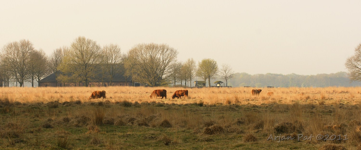 Een wandeling dwars over het Hijkerveld. Op de voorgrond een paar Schotse Hooglanders met kalf en in de verte de schaapskooi.