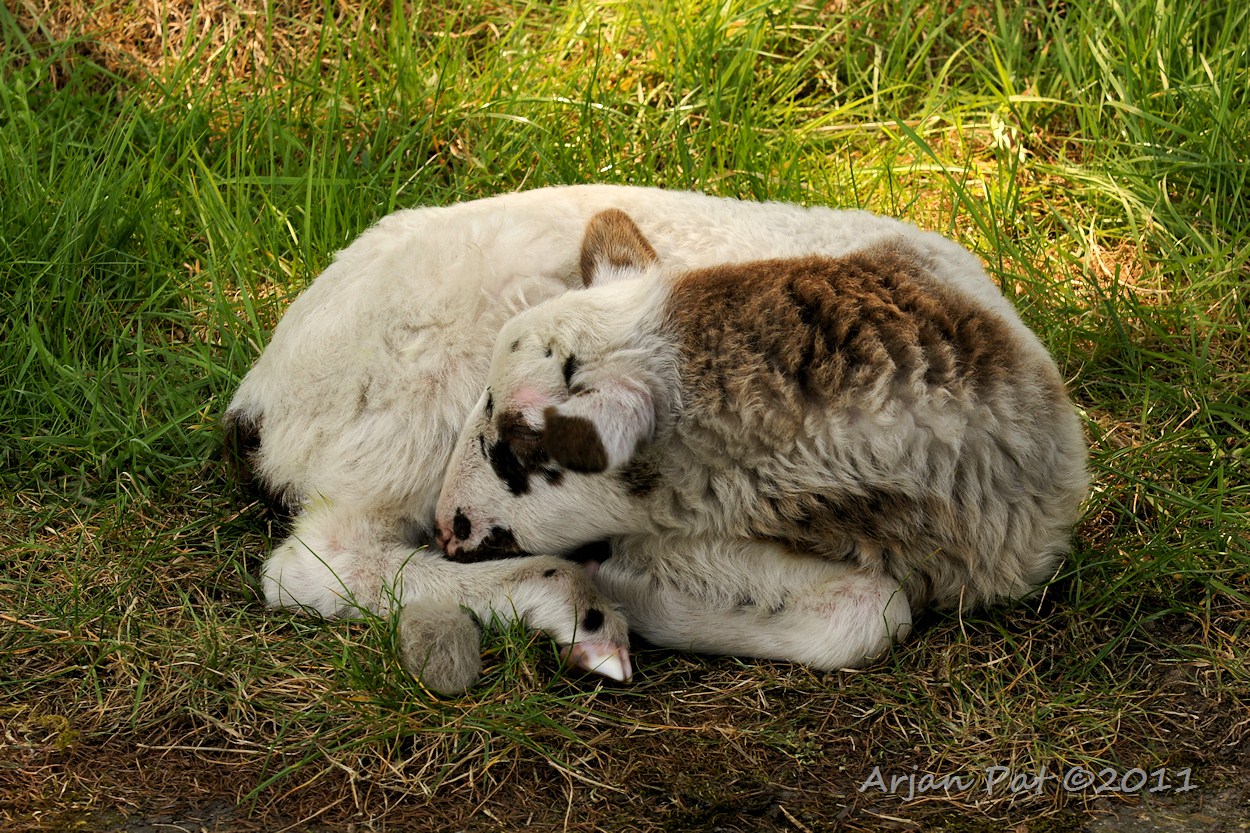 Toen ik 's middags op de terugweg de heide verliet en het bos richting Hooghalen in wou lopen, lag achter het hek en wildrooster een lammetje te slapen.