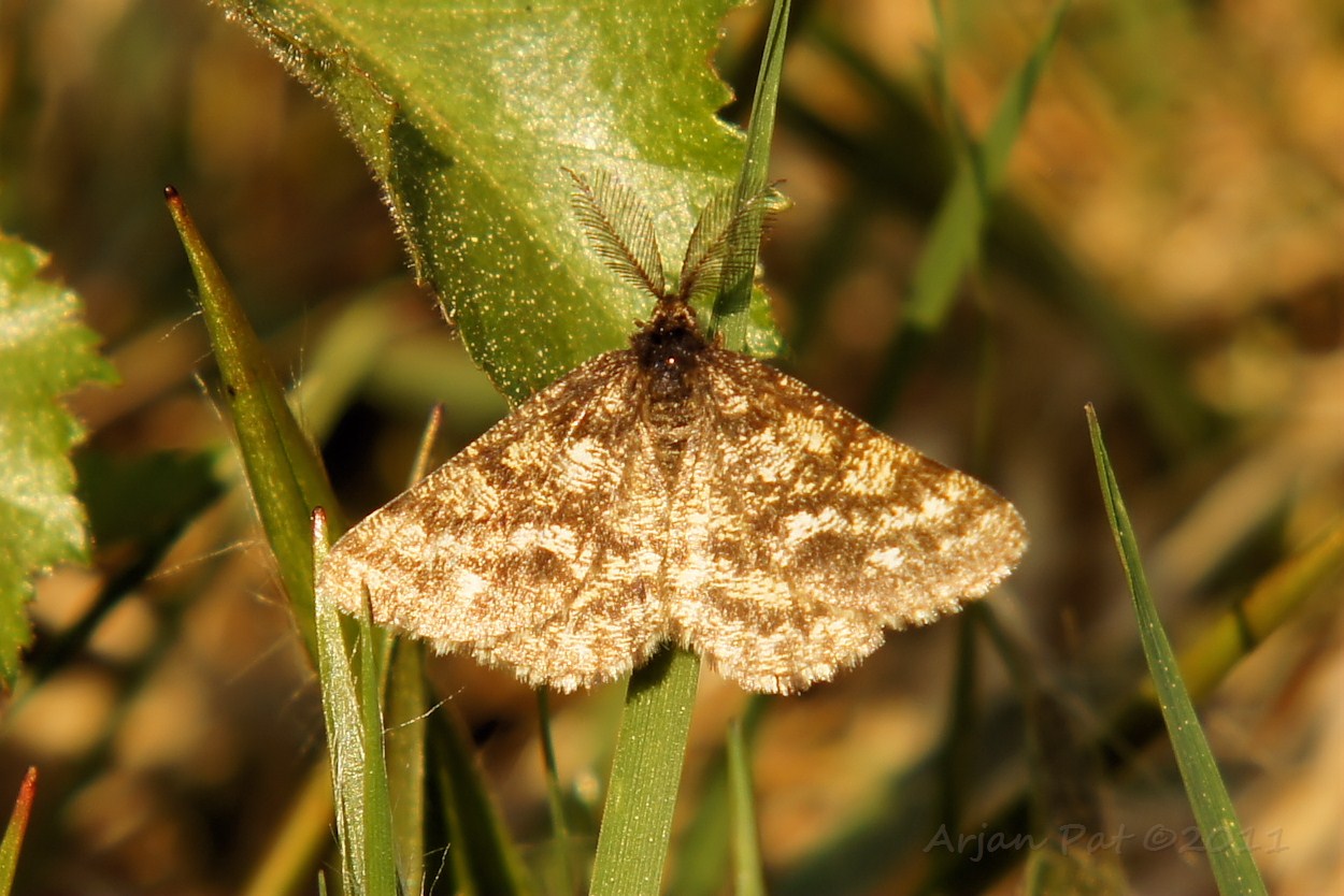 Lijkt veel op de Witte Grijsbandspanner, maar bij de Bruine Grijsbandspanner zijn de strepen meer gebogen.