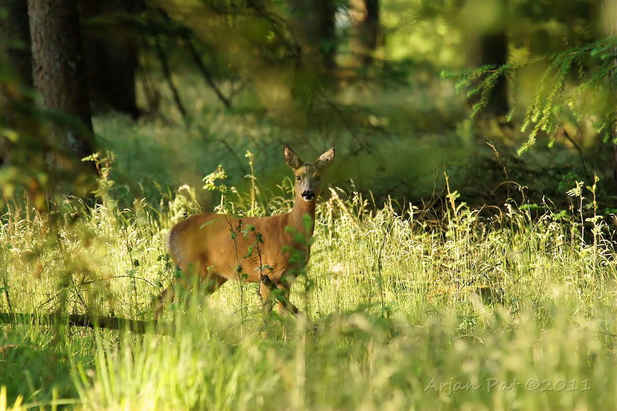 Gekke (mooie) bij deze situatie was, dat het hier om 2 reeën gaat, die een schim zagen, maar niet konden pinpointen wie of wat dat was. Ze keken wel mijn kant op, renden 5 meter, bleven weer een poosje staan en maakten geregeld een heel hard 'blaffend' geluid. Na zo'n 5 minuten dit ritueel herhalend, gingen ze er toch maar vandoor, met veel lawaai.