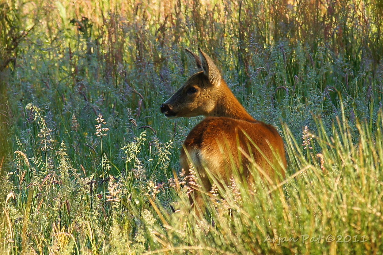 Deze ree was alleen en heeft mij uiteindelijk nooit gezien, maar ze was wel alert. Elke keer als haar kop weer in het hoge gras verdween kon ik weer een paar meter dichterbij komen. Door de dichte begroeiing raak je haar wel eens uit het oog. Dit zijn de momenten, dat je niet weet of ze je gezien heeft en of ze nog op dezelfde locatie staat. Ik heb haar verder rustig laten doorgrazen en ben vrij snel doorgelopen.