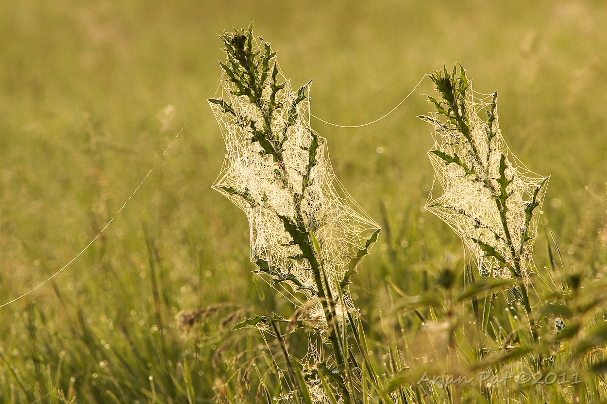 Er is wel een soort kabeltje tussen de verschillende distelplantjes gespannen.