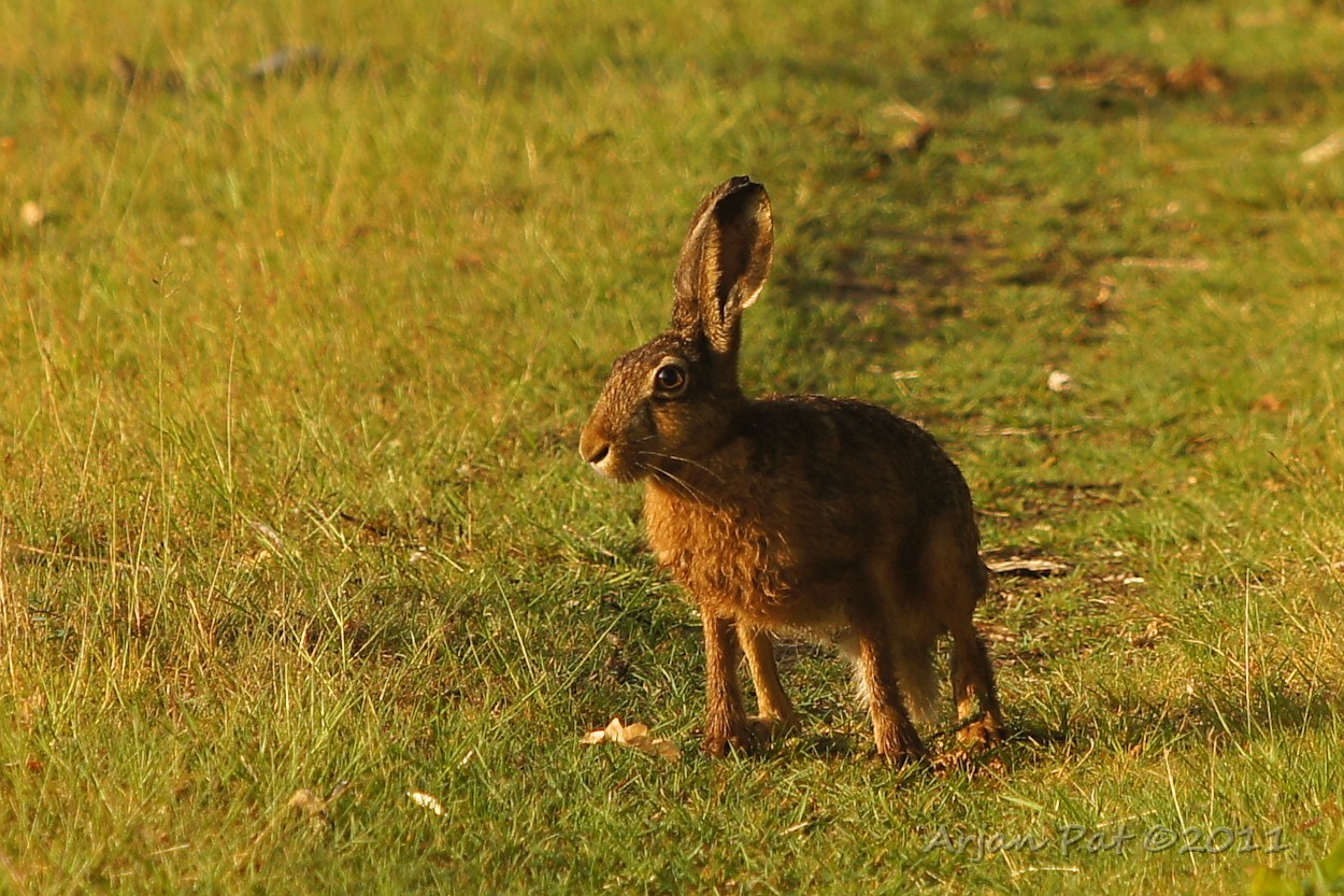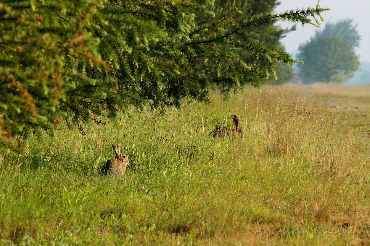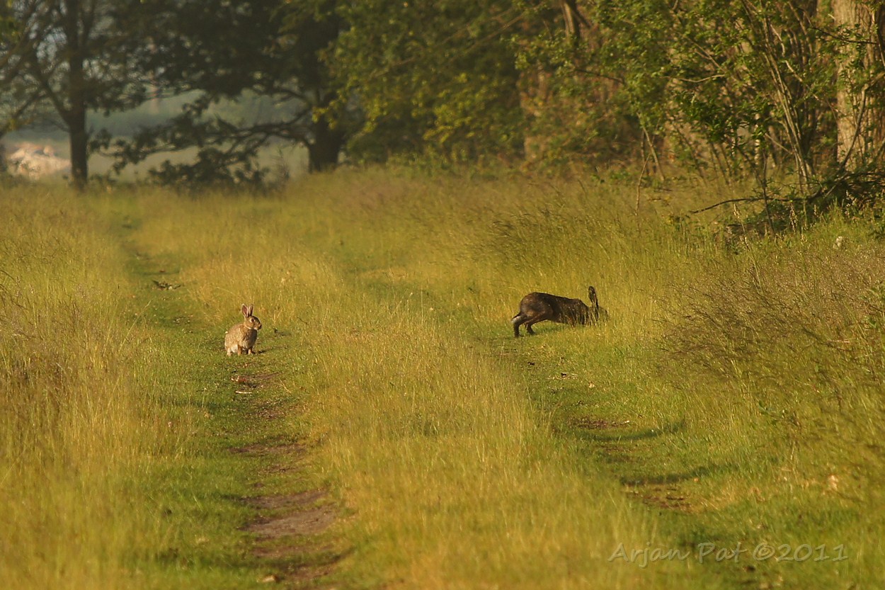 Deze haas en dit konijn passeerden elkaar, elk aan de juiste kant van de weg. Het konijn huppelde langzaam vooruit en hield de haas nauwlettend in de gaten. De haas snuffelde onversaagd door. Het konijn schrok wel even van de rechts afslaande beweging van de haas.