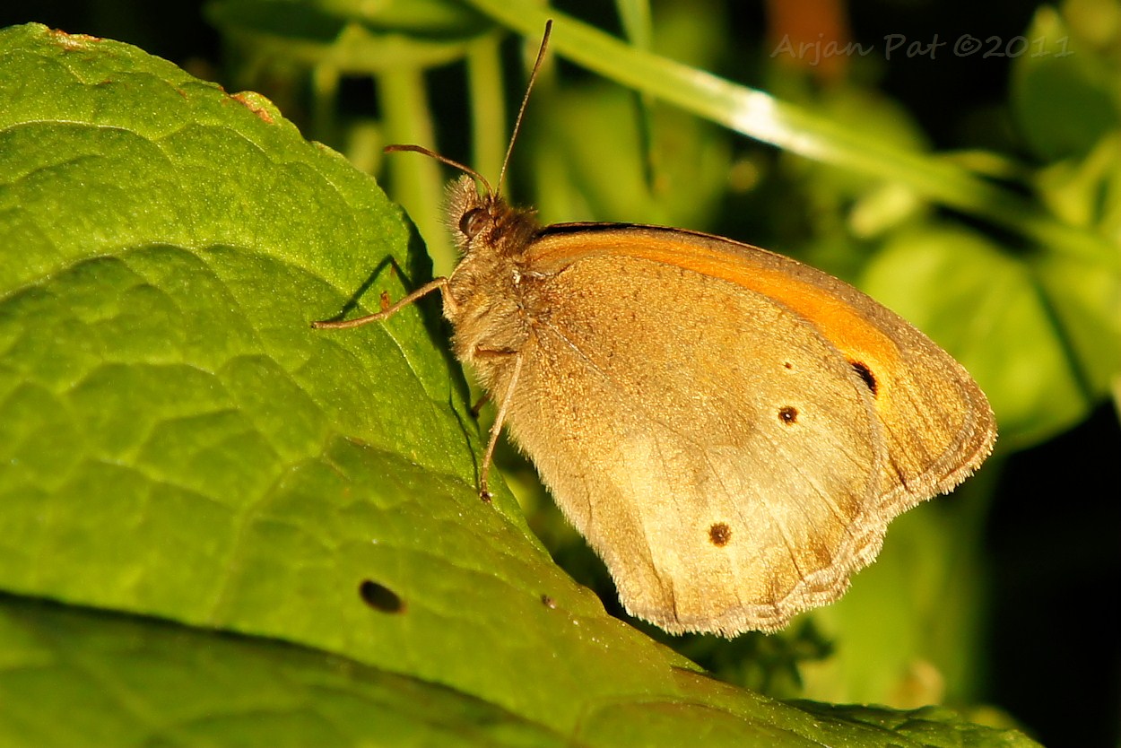 Bruin zandoogje pakt nog zoveel mogelijk van de avondzon op.