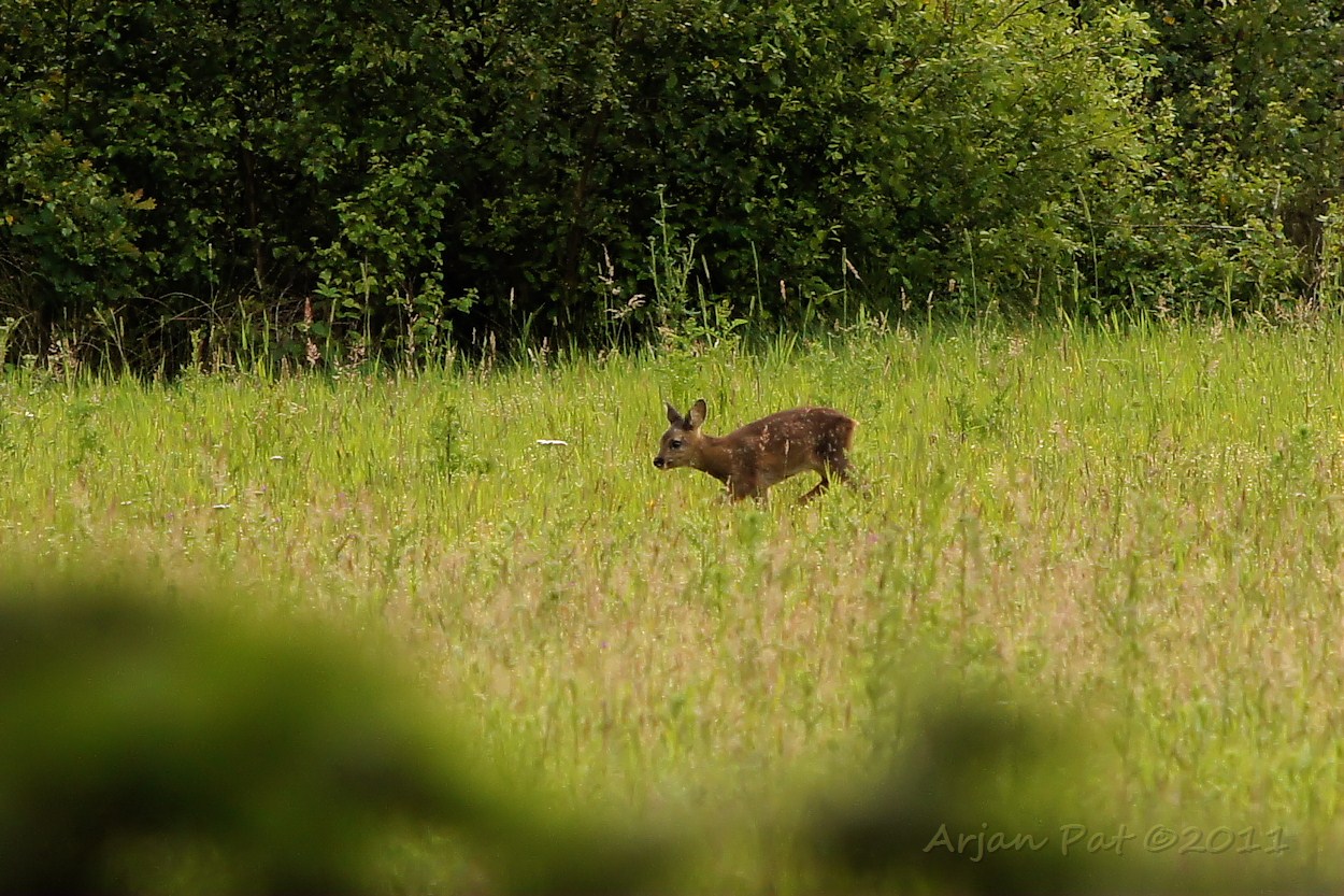 Het kalfje heeft niks in de gaten en huppelt weg van haar moeder, die lekker zat te grazen in een weilandje grenzend aan een heideveldje. De moeder merkte ons na na een paar minuten toch op en wou toen direct wegrennen. Ze kwam al snel weer terug om haar jong te halen. Deze had ook toen nog steeds niks in de gaten en bleef lekker doorspelen in het hoge gras.