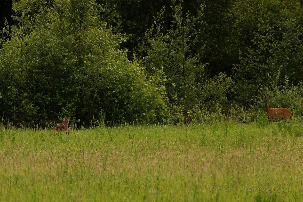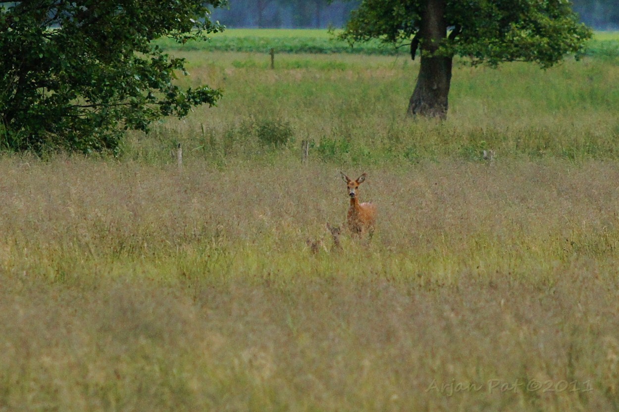 Een reegeit met 2 jongen, door het hoge gras bijna niet te zien.