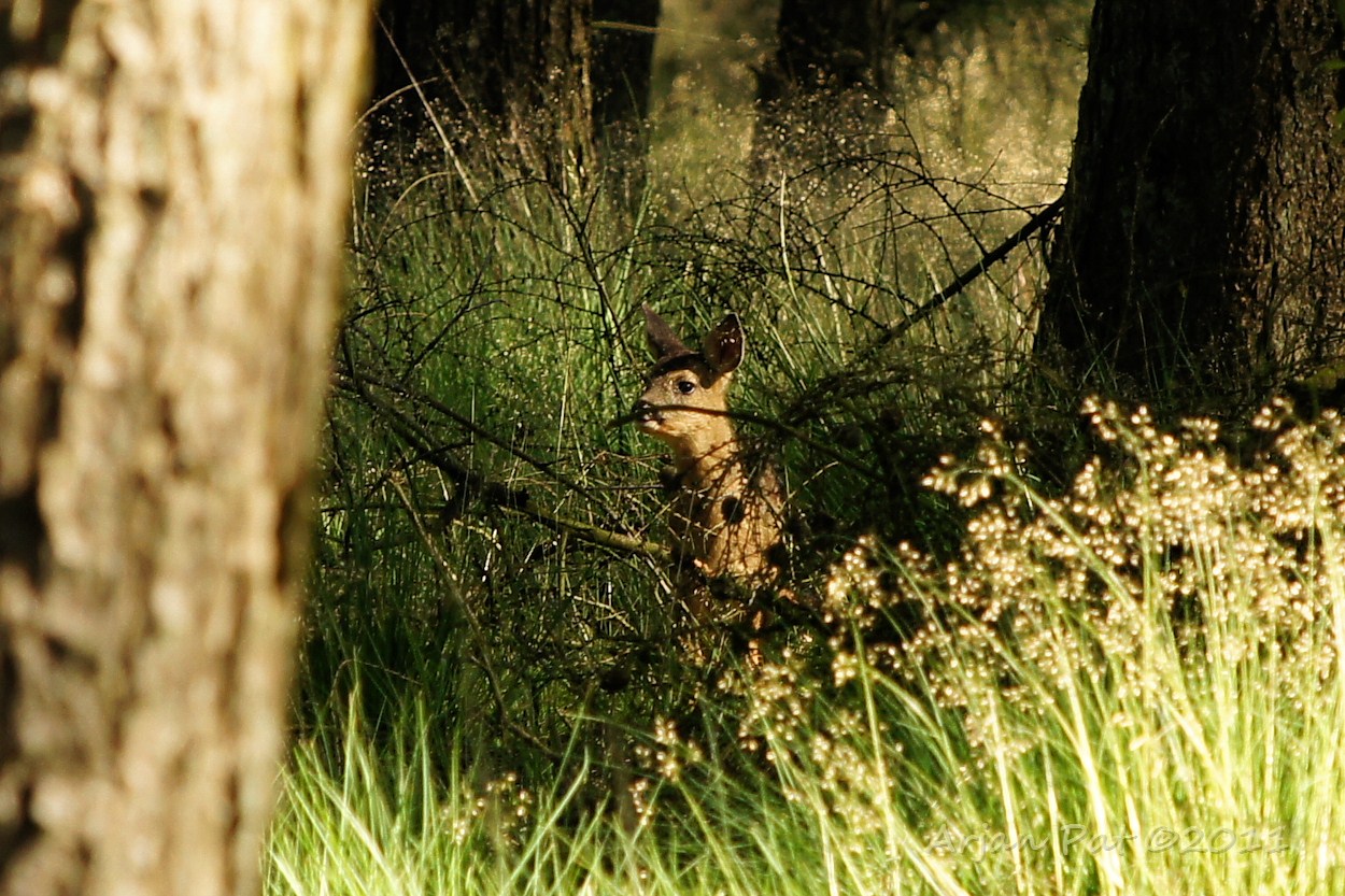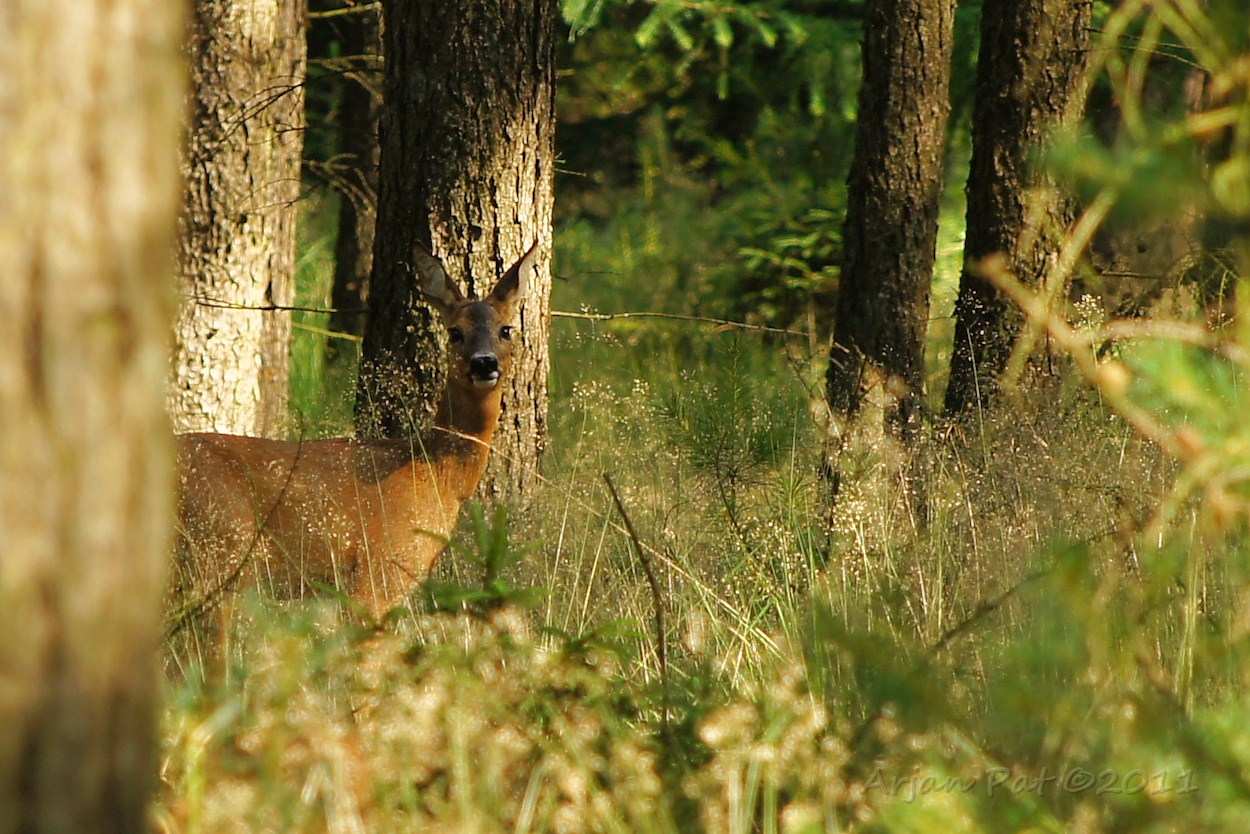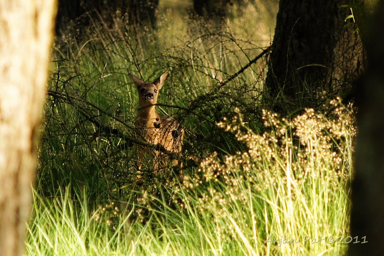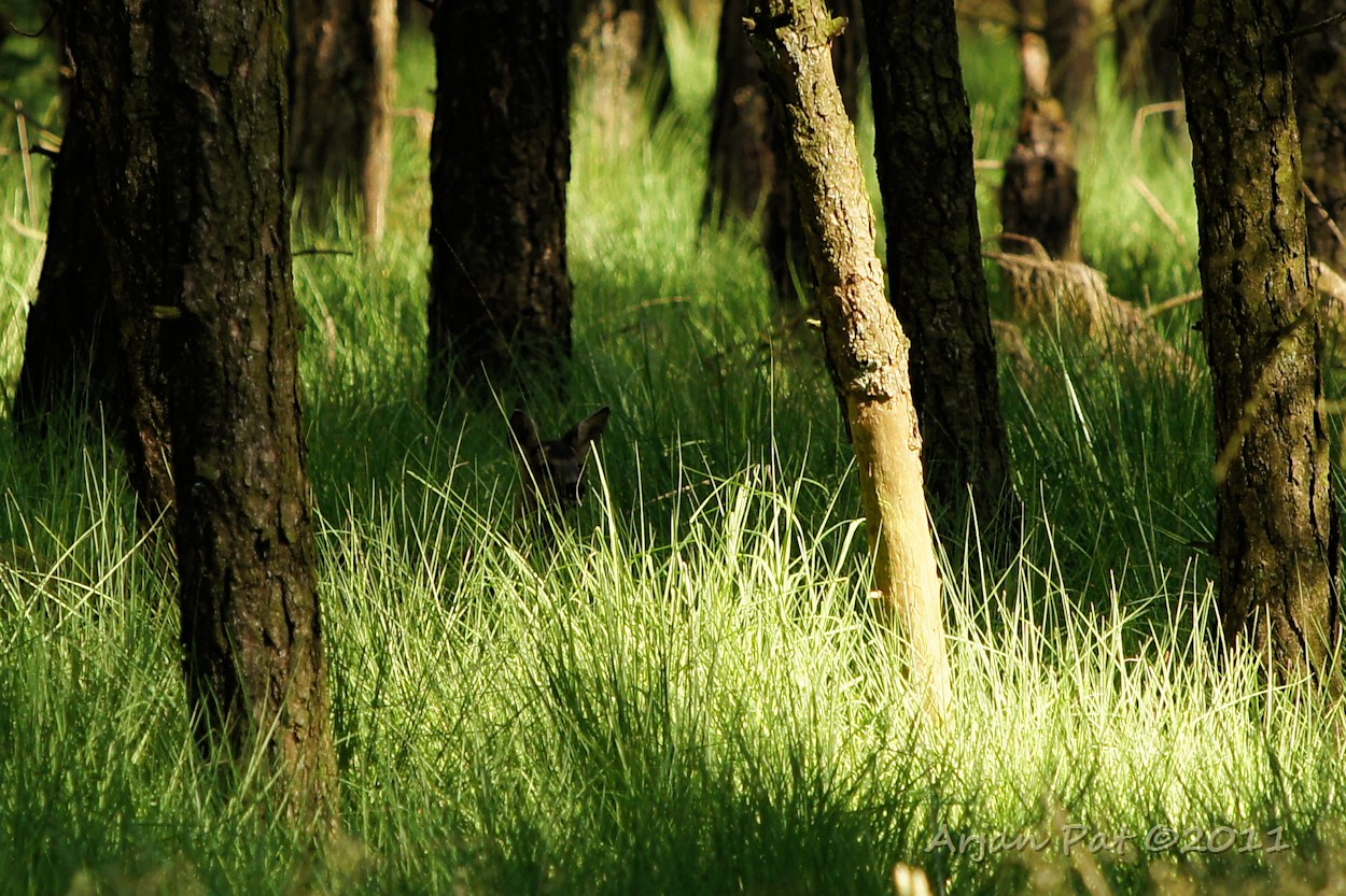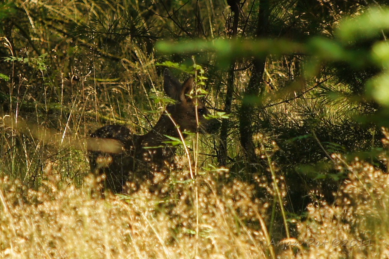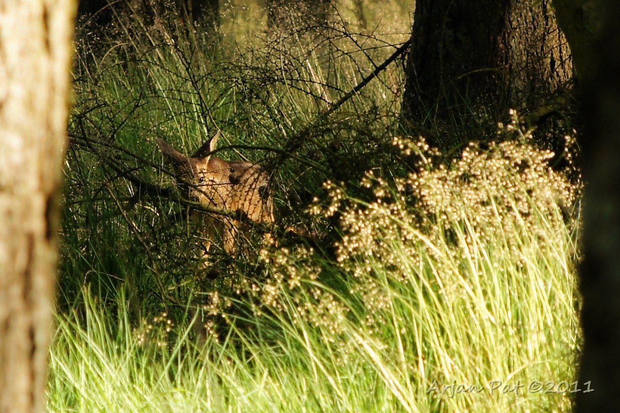 Hij dartelde er vrolijk op los. Meestal echter achter en in de schaduw van bosjes en bomen. Hier staat ie zo'n beetje op z'n dichts (± 15 meter) van mij af.