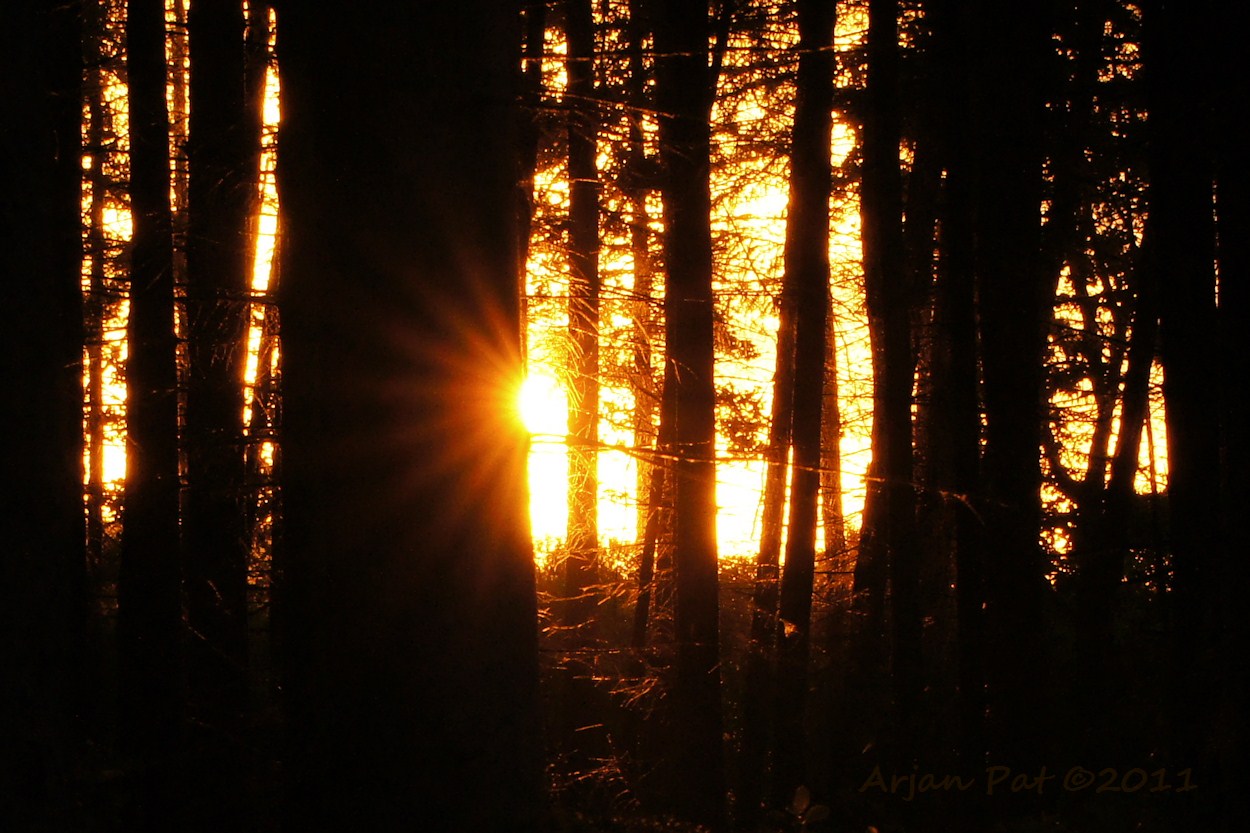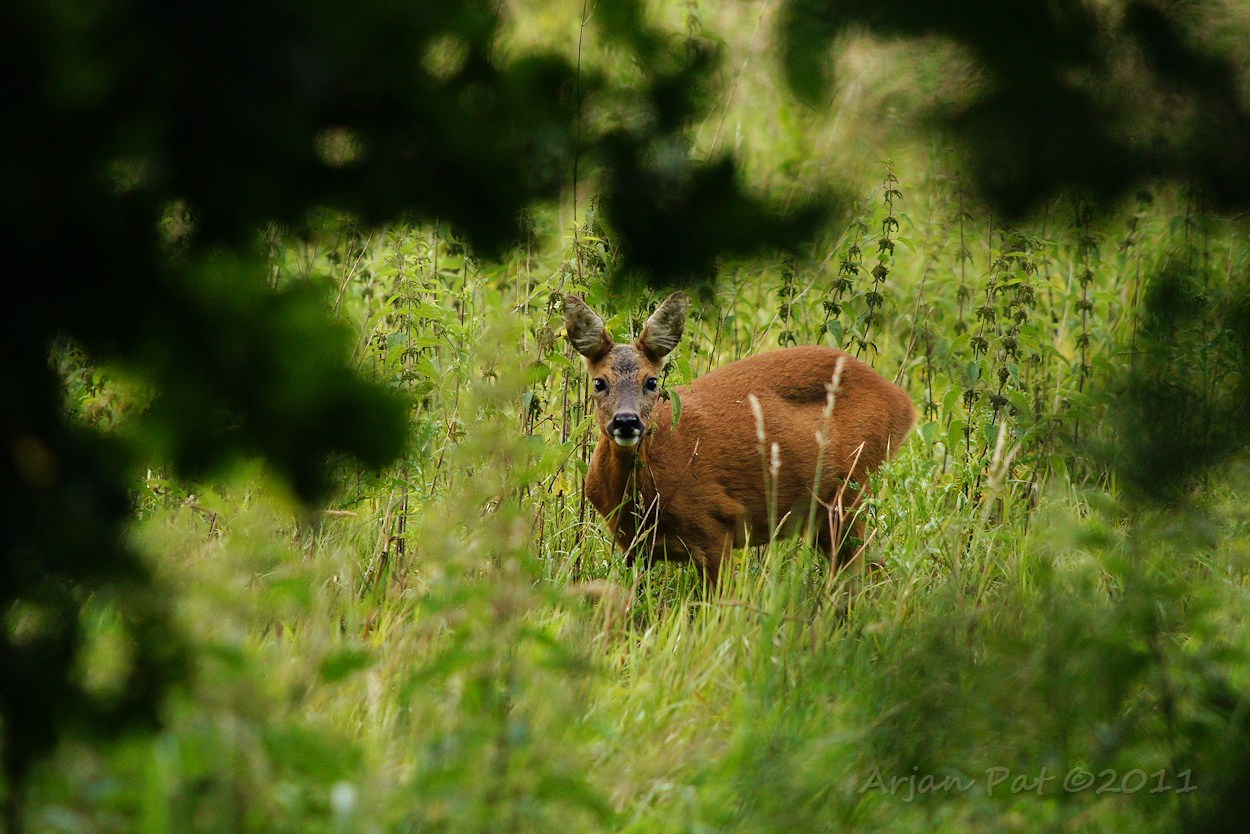 Het was nog geen half uur voor zonsondergang, toen ik een ree met jong in een open veldje zag grazen. Ze liepen langzaam maar zeker op mij af, maar ik had geen goede positie. Zou ik mij bewegen, dan zouden ze me zeker zien. Ik heb bijna een kwartier roerloos aan de rand van een bosweggetje gestaan om deze foto te maken (normalerwijze niet mijn ding om zolang ergens te staan wachten). Ik stond zodanig verkeerd, dat ik geen goed uitzicht had. De reeën stonden weliswaar op 3-4 meter van mij vandaan te grazen, maar aan de andere zijde van een grote struik. Dit keer werd mijn geduld echter beloond, ze zagen mij niet en staken op een gegeven moment het bosweggetje over. Toen kon ik mijn 3 foto's maken. Het geluid van de camera werd gehoord, zoals aan de houding van het kalfje wel te zien is. Moeder en jong zetten het daarna op een lopen en verdwenen in het inmiddels donker geworden bos.