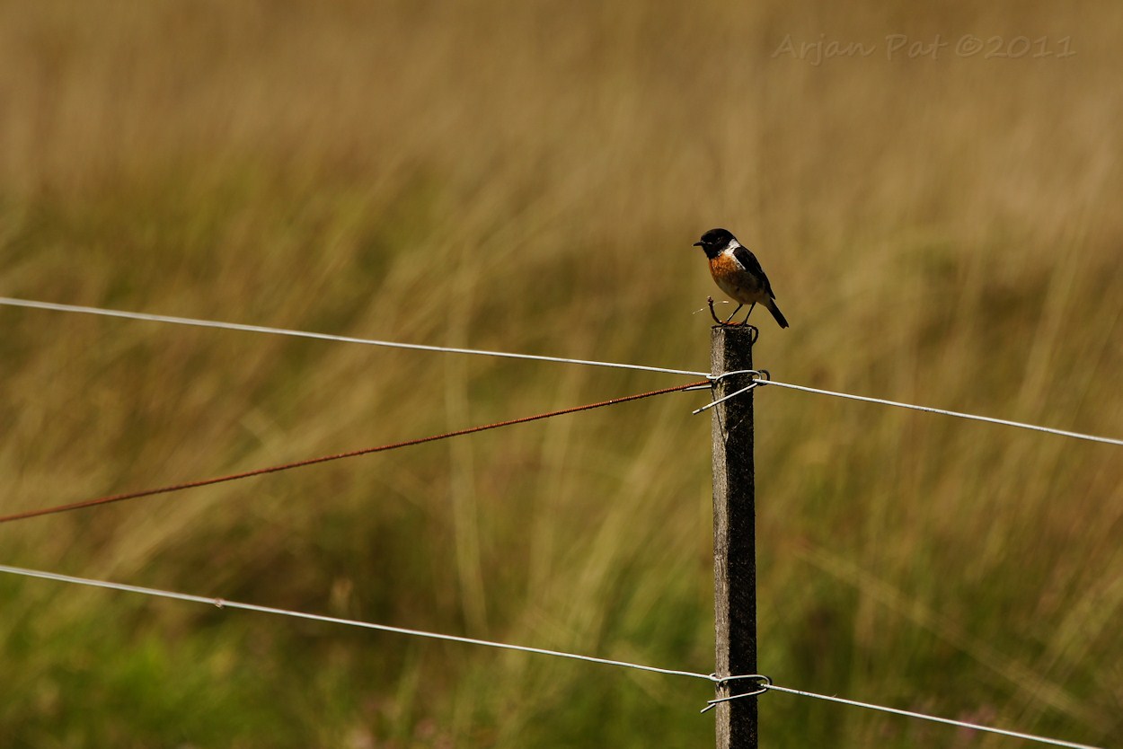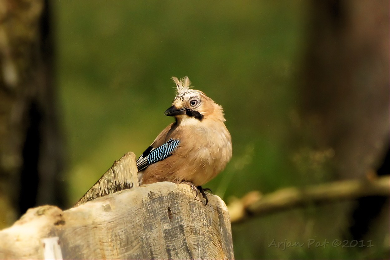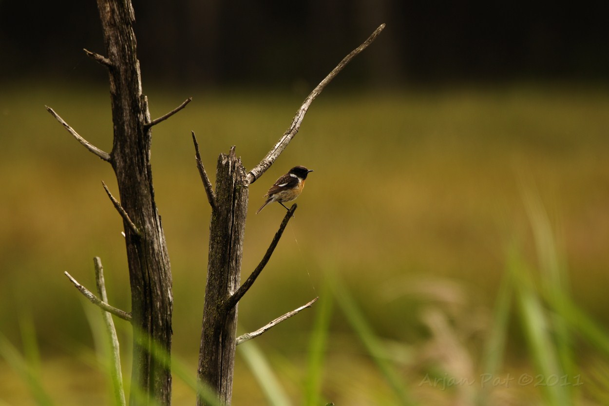 Deze roodborsttapuit staat op één pootje op de resten van een dode boom.