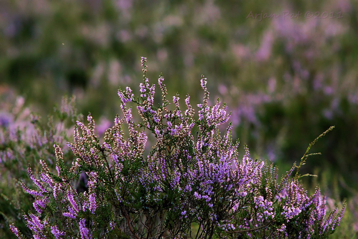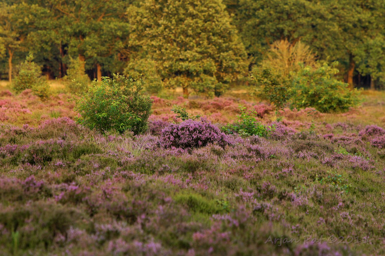 De ondergaande zon scheen nog net een beetje over het bos heen, waardoor je mooi belichte heidevelden kon zien.