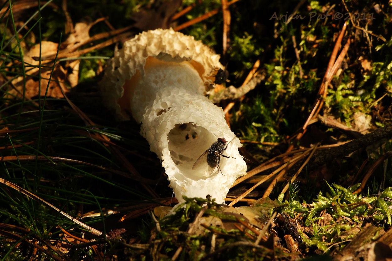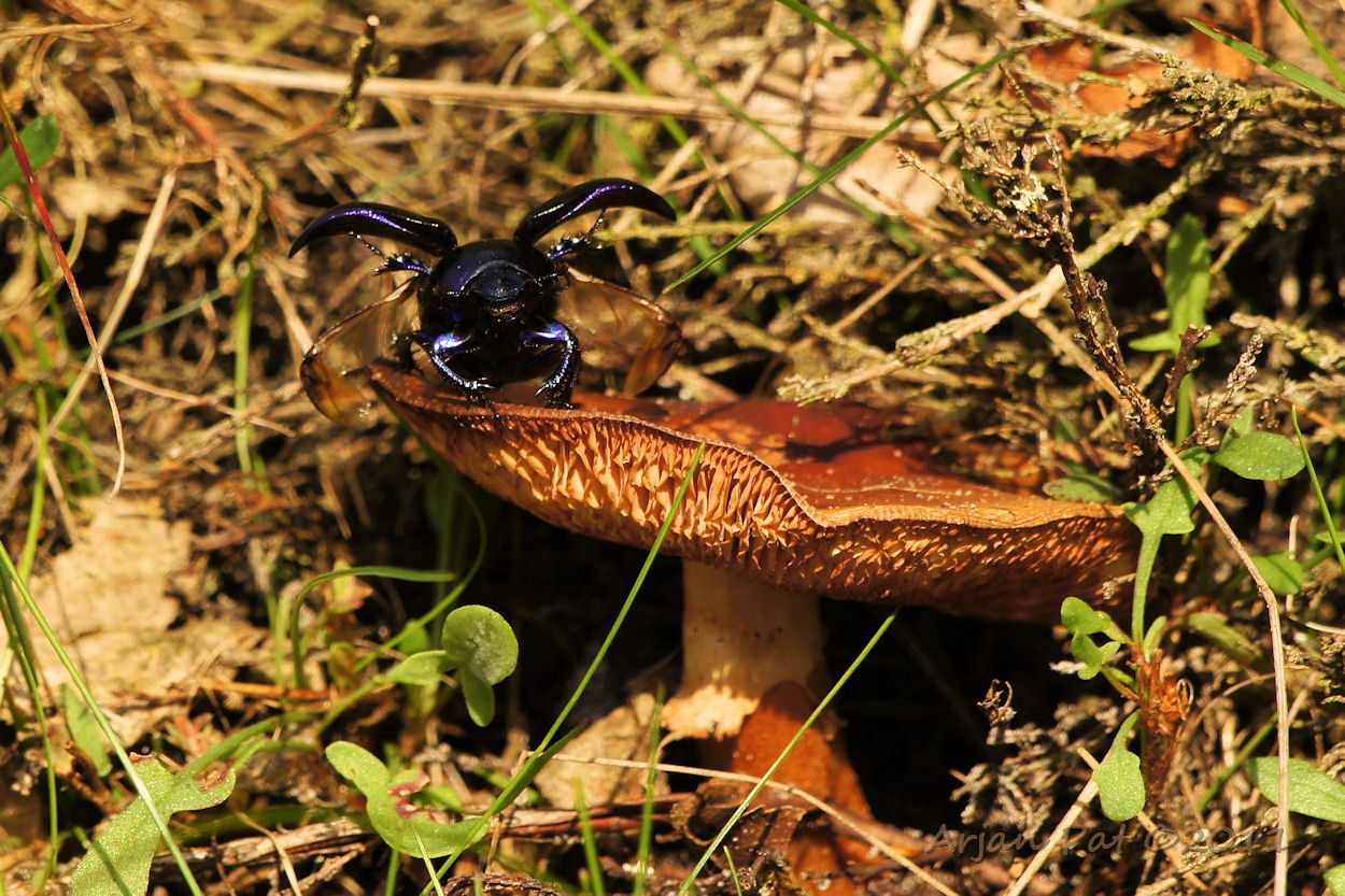 Deze zwarte tor gebruikt deze paddenstoel als opstijgplateau.