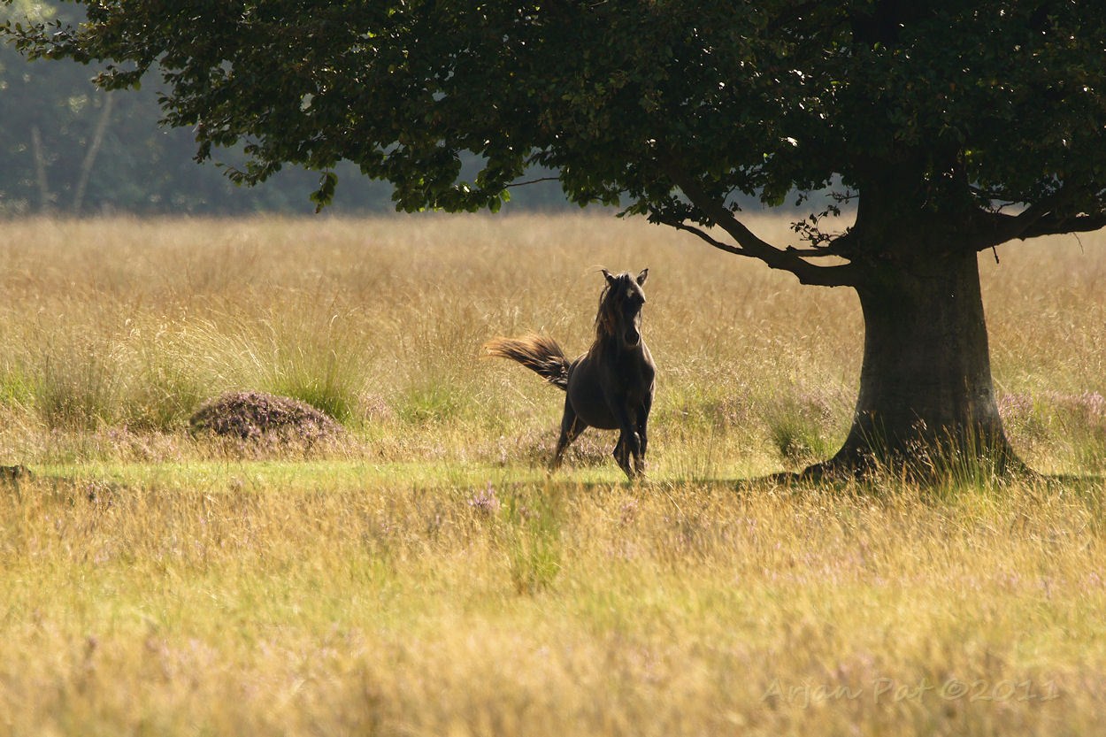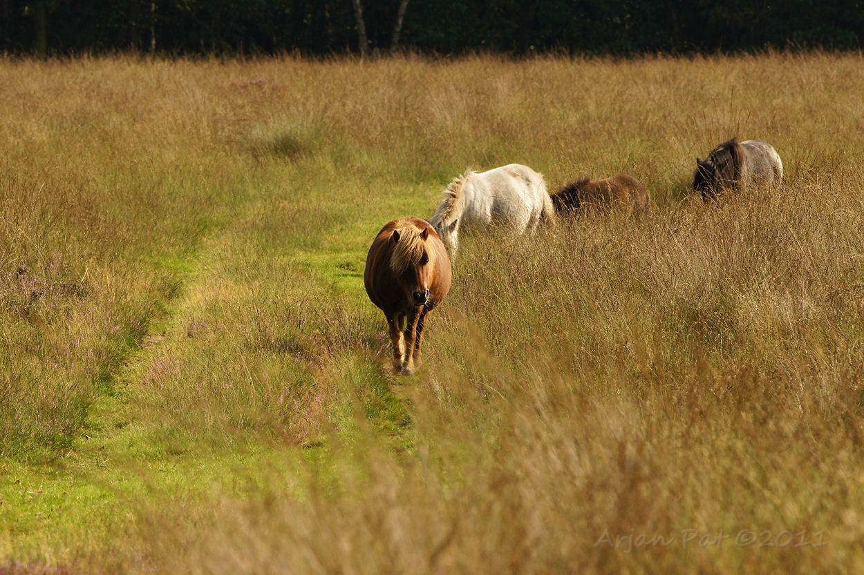 Op de heide liepen veel pony's rond.