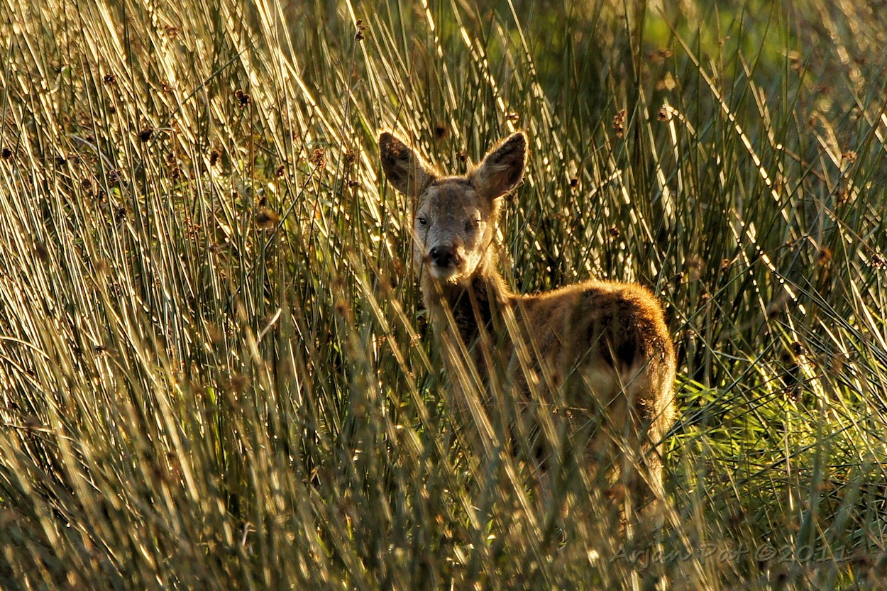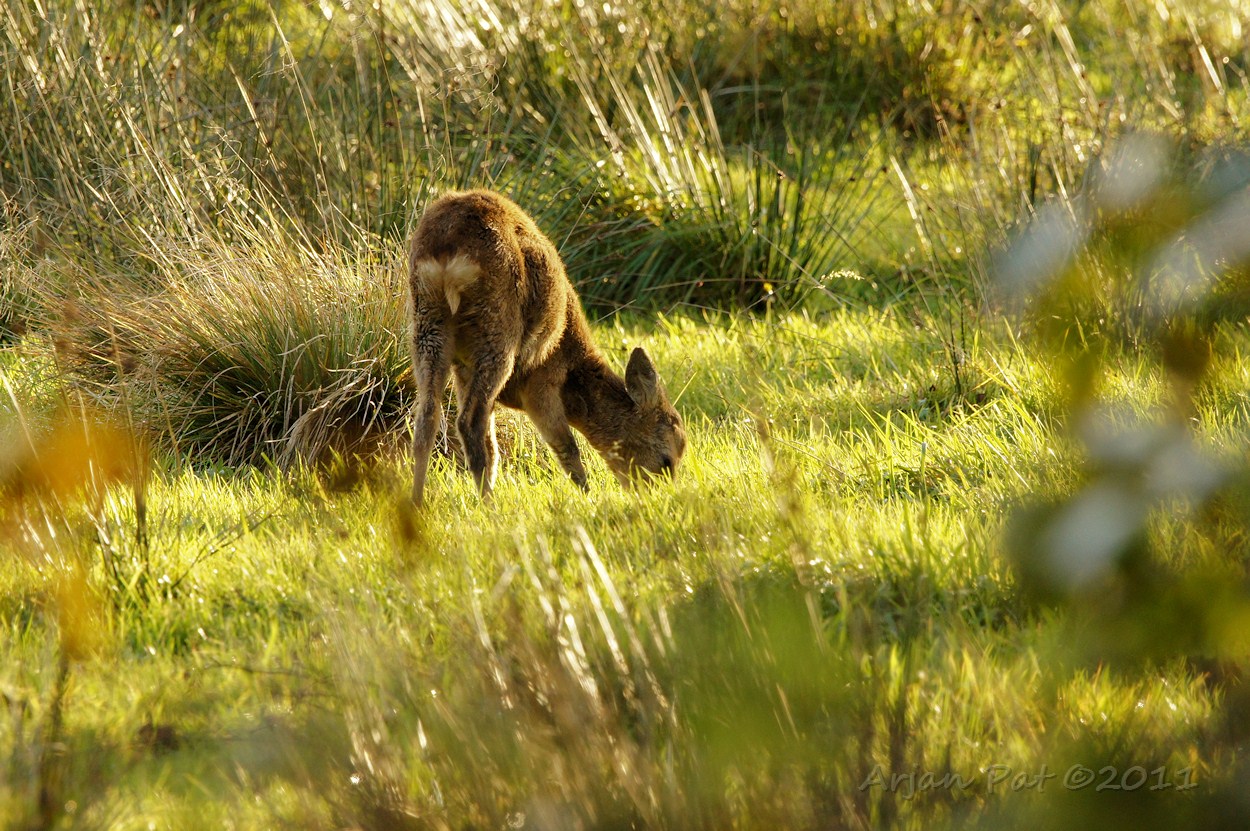 Dit jonkie is over het algemeen ook wel een beetje 'minder voorzichtig'. Eerder dit jaar, toen alle drie nog tezamen waren, was dit jong altijd de laatste die mij opmerkte en zelfs dan nog vrolijk door bleef grazen. Ook nu weer; hij hoorde het klikken van de camera, keek even op, maar bleef daarna rustig doorgrazen.