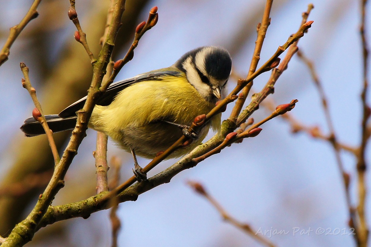 Er is, door het zachte weer, genoeg te eten voor de pimpelmees. Ze eten alle knopjes op.
