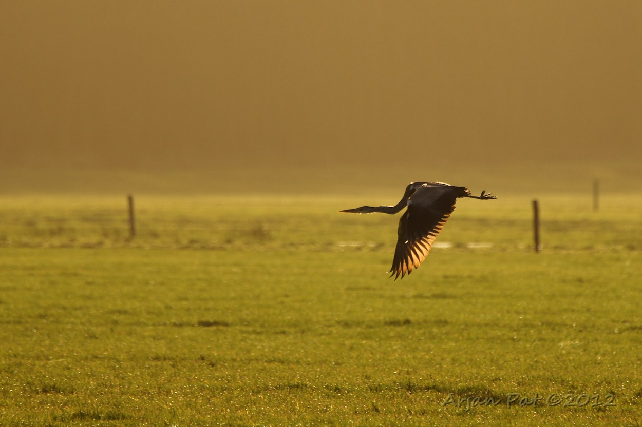 Deze reiger liep voor mij uit. Als ik te dicht naderde vloog ie op en landde even verder weer op hetzelfde weggetje. Hier besloot ie om terug te gaan naar onze ontmoetingsplek door met een grote boog om mij heen te vliegen.