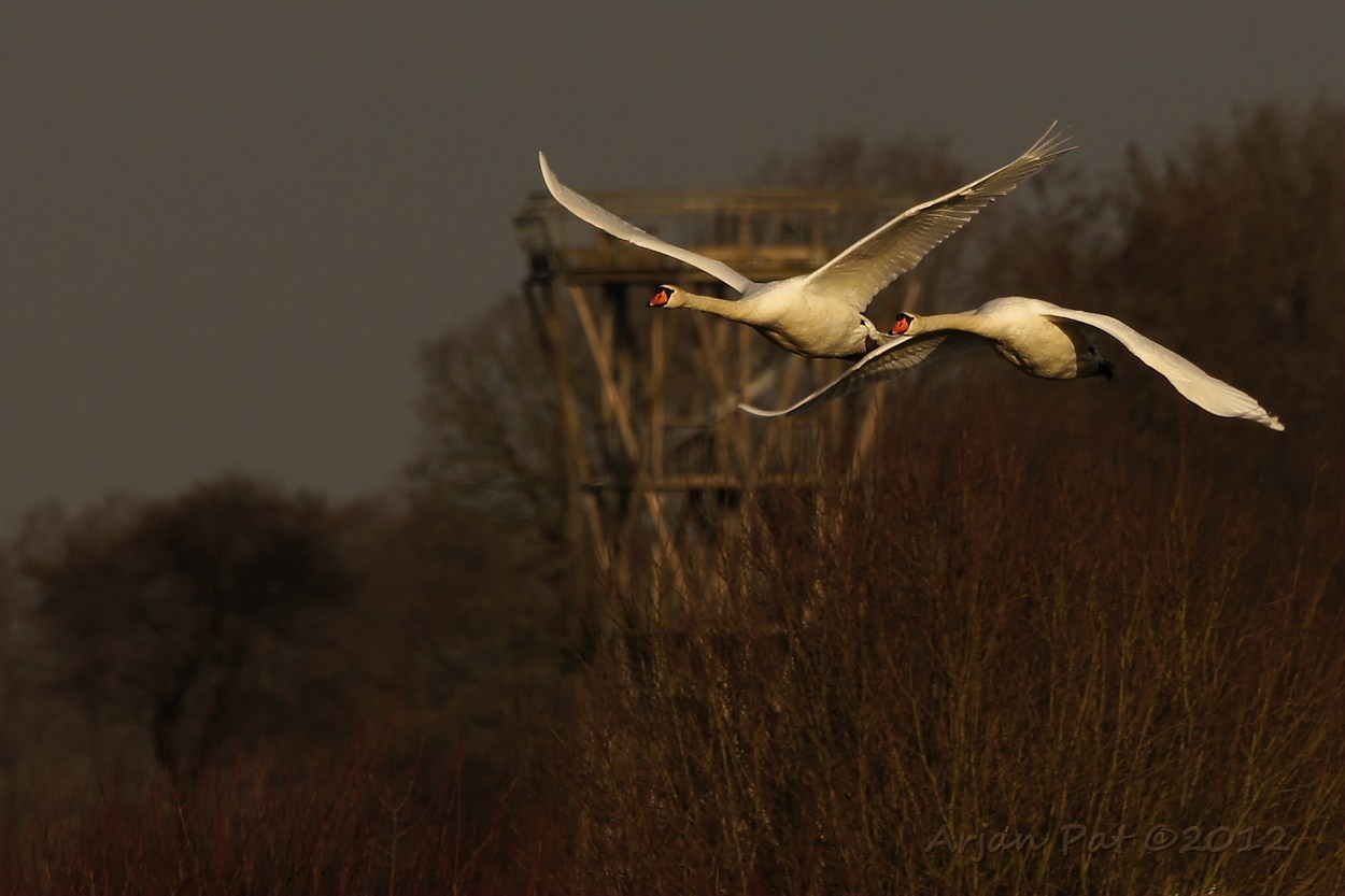 Knobbelzwanen die mijn kant opkwamen. Op de achtergrond (nogmaals) de uitkijktoren.