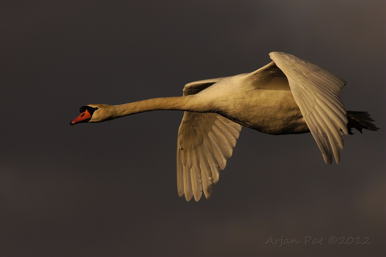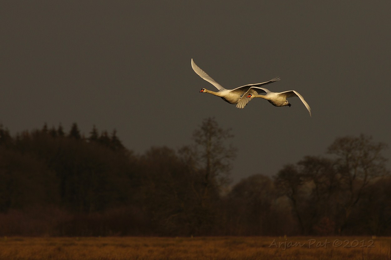 Dit koppeltje zwanen vloog op een paar meter aan mij voorbij. Op één van de genomen foto's vlogen ze zo dichtbij, dat alles erop staat, behalve z'n kop en tenen.