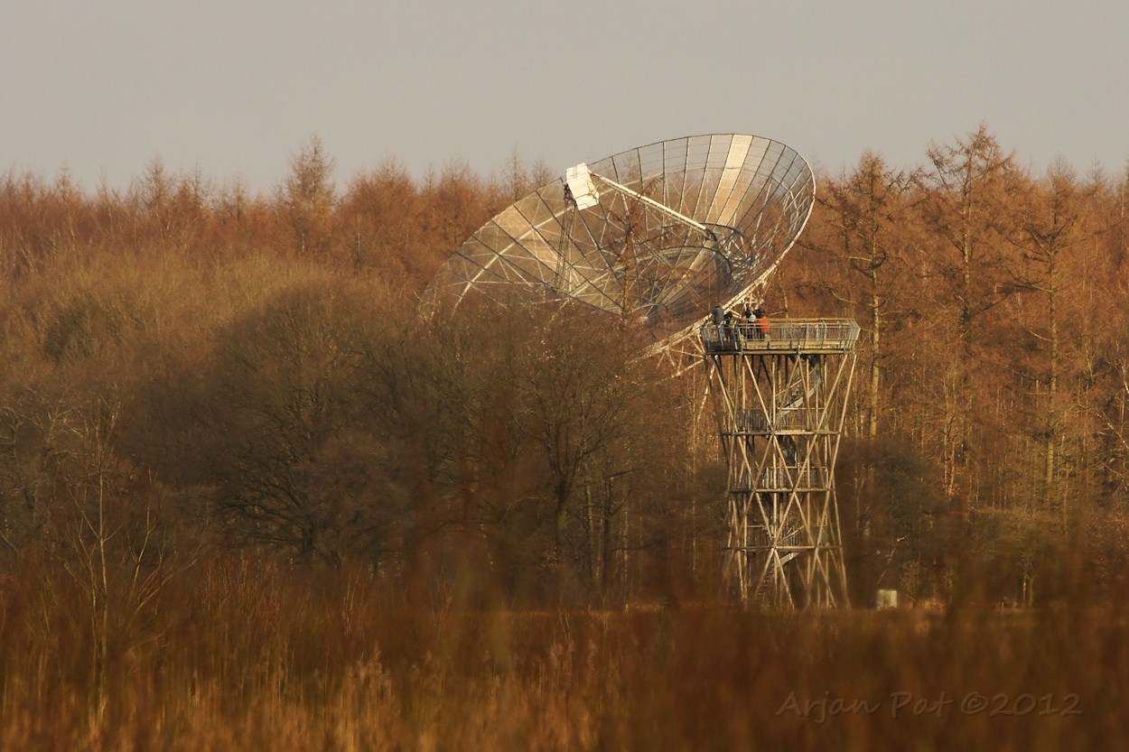 Vanuit de verte lijkt het net of de mensen die op de uitkijktoren staan, recht in de radiotelescoop kunnen kijken.