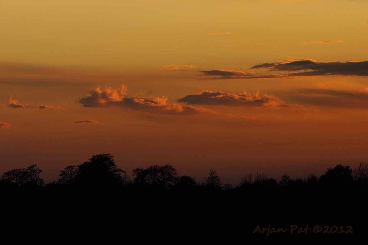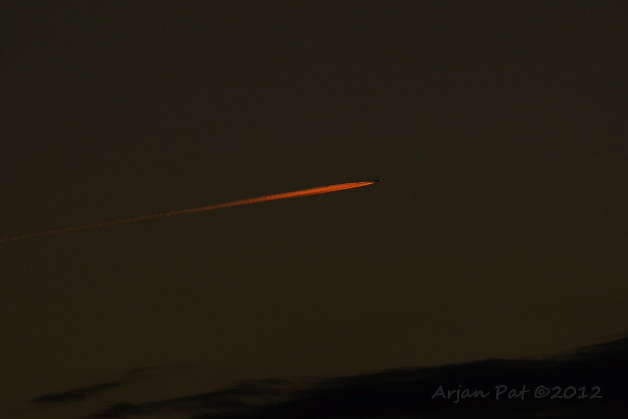 Nee, geen komeet, maar een tuigvliegje met rode staart door de ondergaande zon.