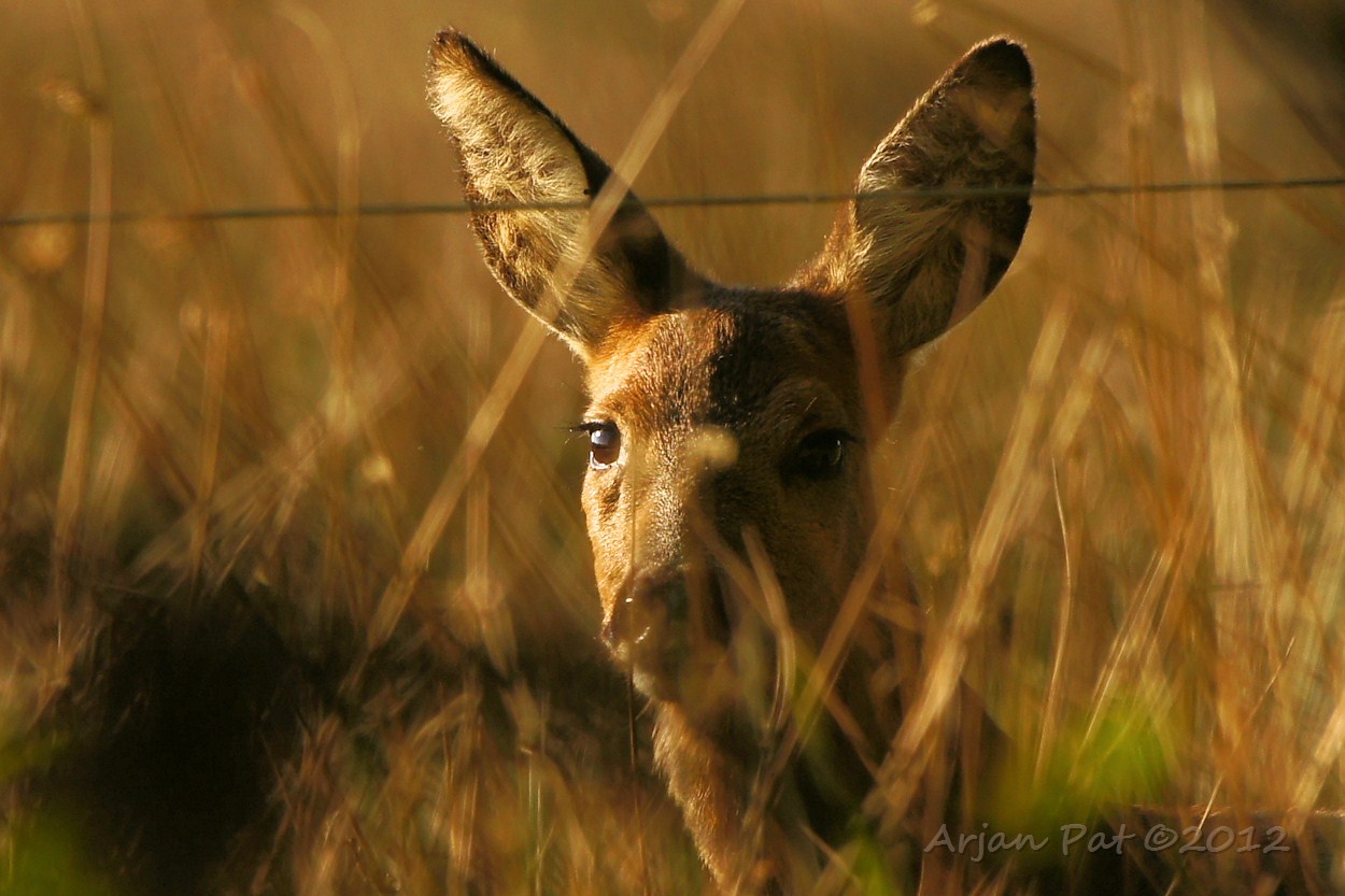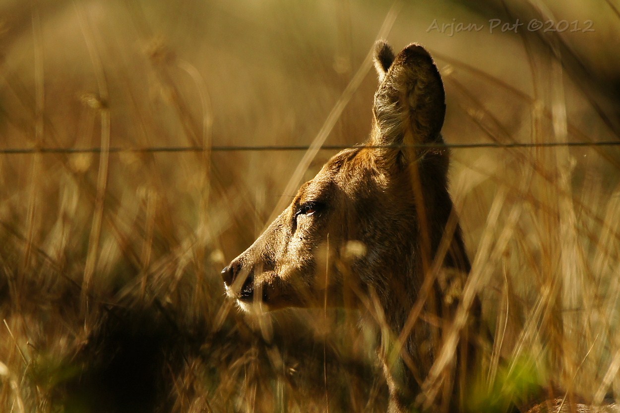Een ree aan de ene kant van de begroeiing en ik aan de andere. Ik zag haar al ver van te voren voor mij aan lopen. Langzaam maar zeker kwam ik dichterbij en kwam zo'n beetje oog in oog te staan met deze reegeit.