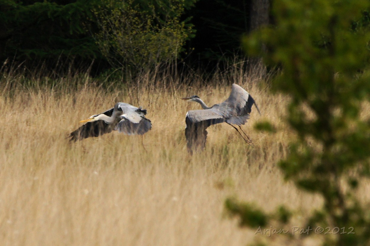 De reiger rechts kwam aangevlogen en heeft de andere reiger weggejaagd, zonder slag of stoot.