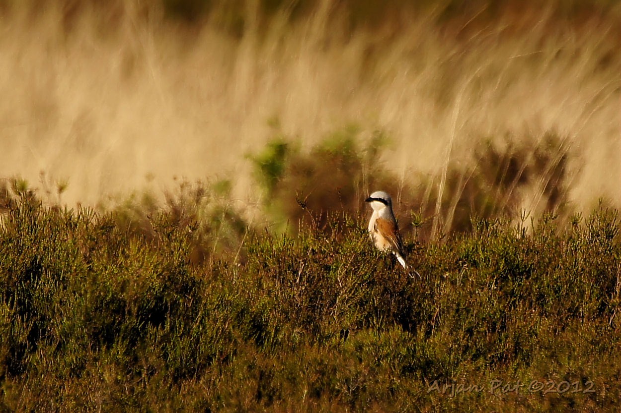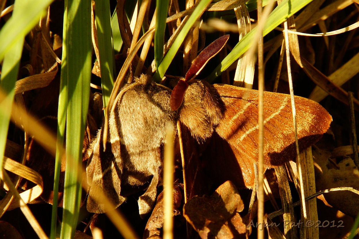 Een boel geritsel in het gras. Ik dacht aan een muis of zo, maar het waren 3 of meer uit de kluiten gewassen motvlinders. Hier zie een mannetje en een vrouwtje duidelijk. Het tweede mannetje zit links ietwat verscholen.