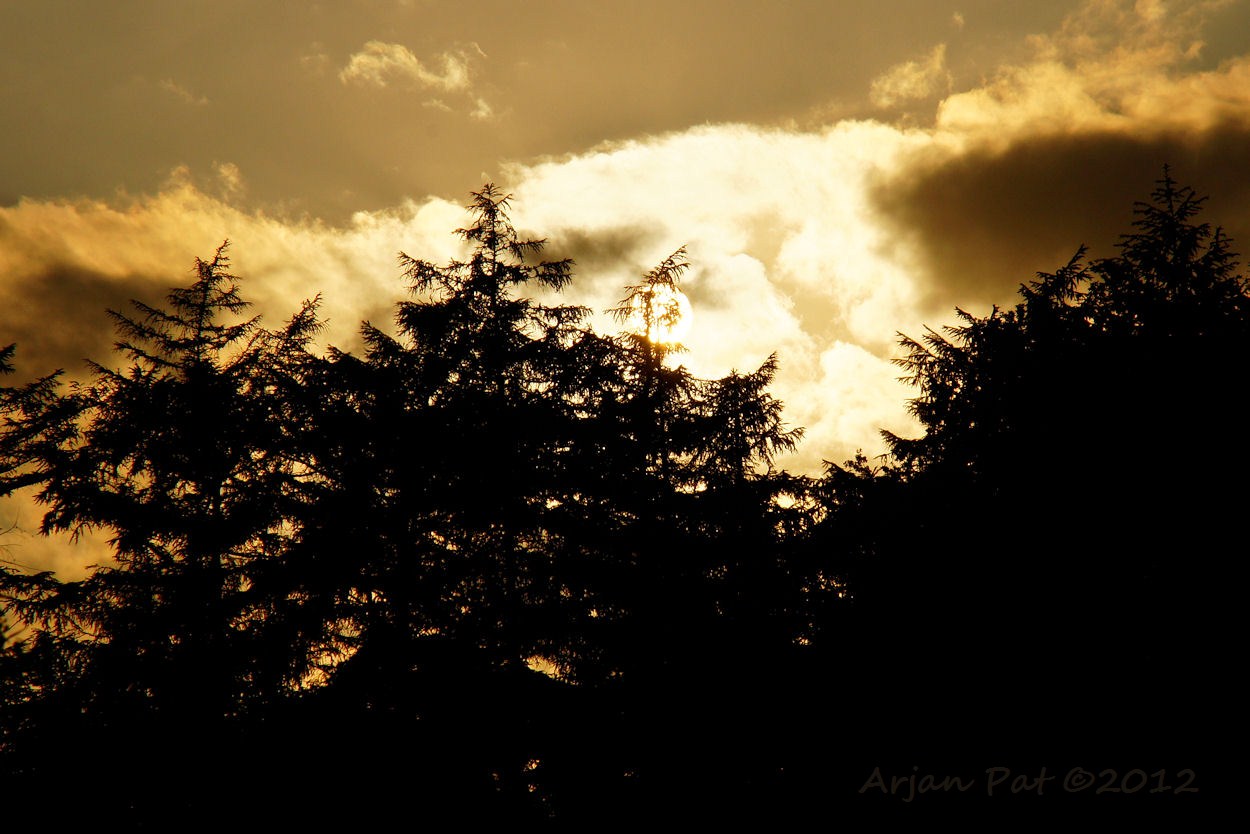 Zon schijnt mooi rood, onder de wolken door.