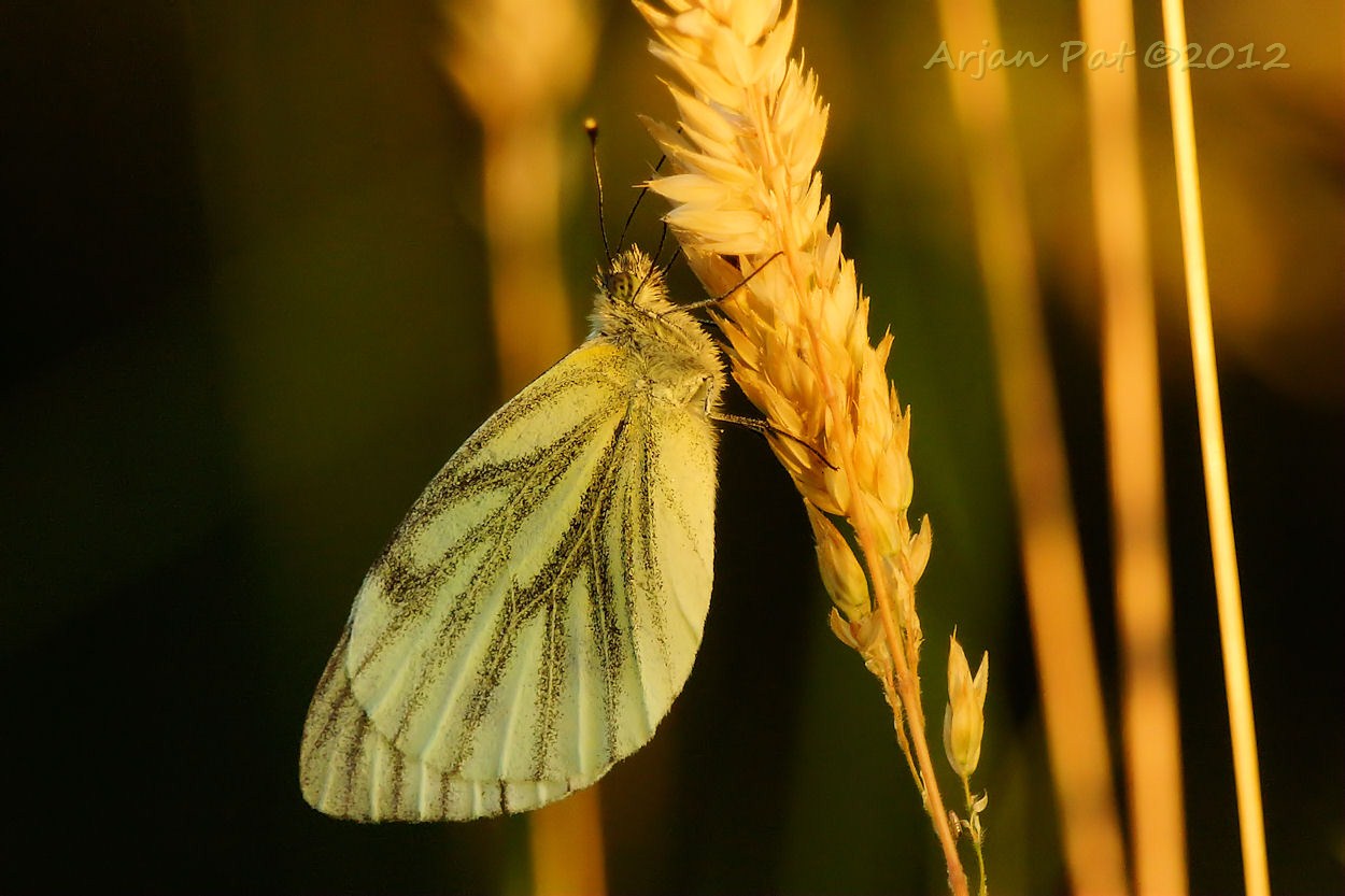 Vlindertje slaapt nog als de zojuist opgekomen zon op dit bewegingsloze beestje schijnt.