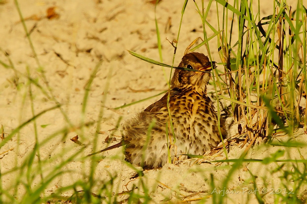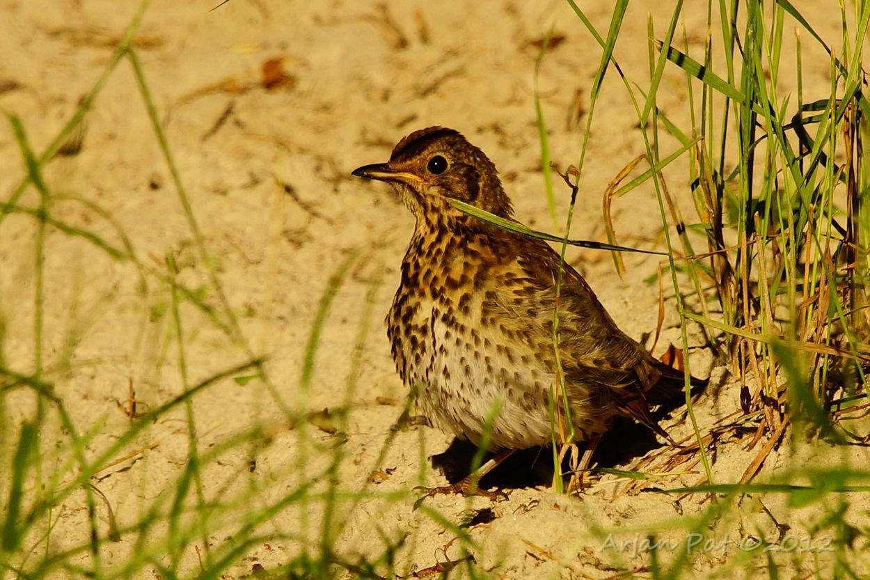 Ik heb toch enkele minuten gekeken naar deze zanglijster, die lekker lag te badderen in het witte zand....