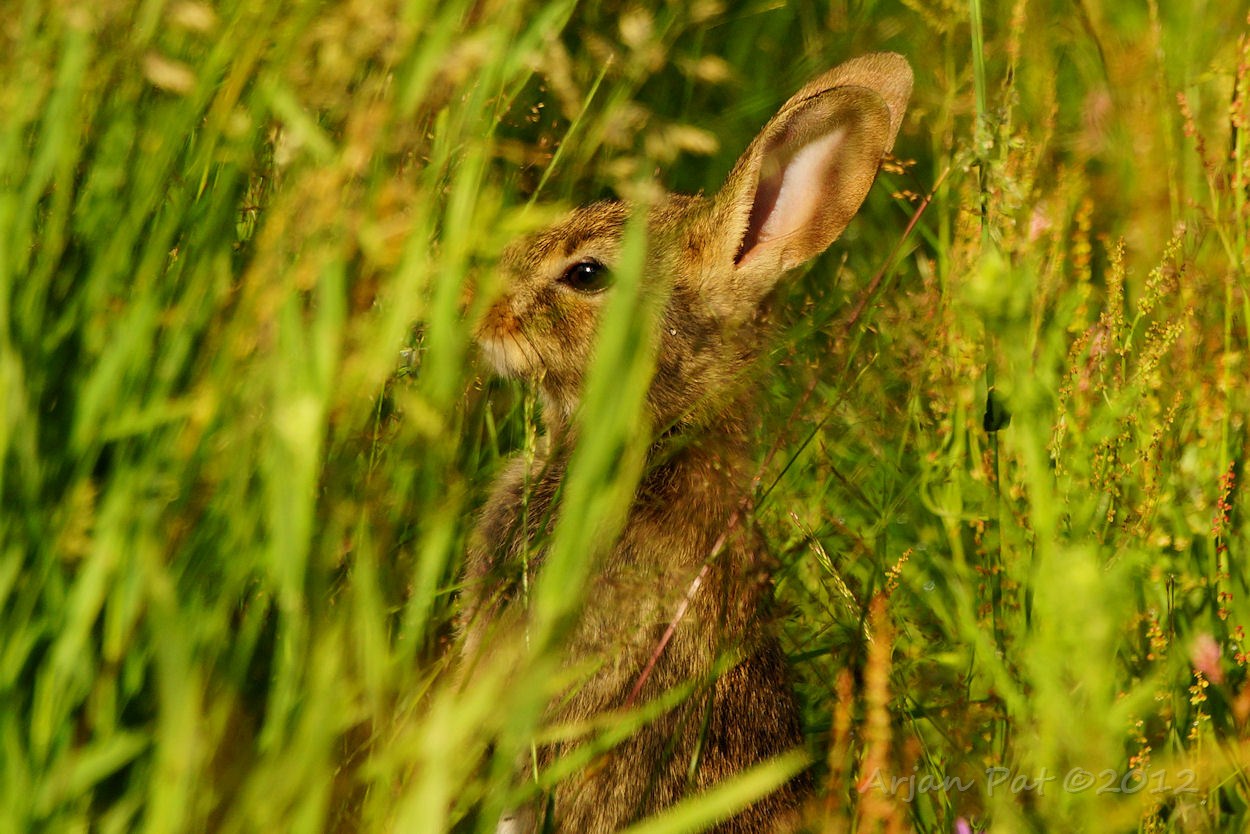 Het is een dag van wederzijdse verrassingen geloof ik, want plots zat er een konijntje naast me te knabbelen aan het sappige gras (zelf niet uitgeprobeerd overigens)