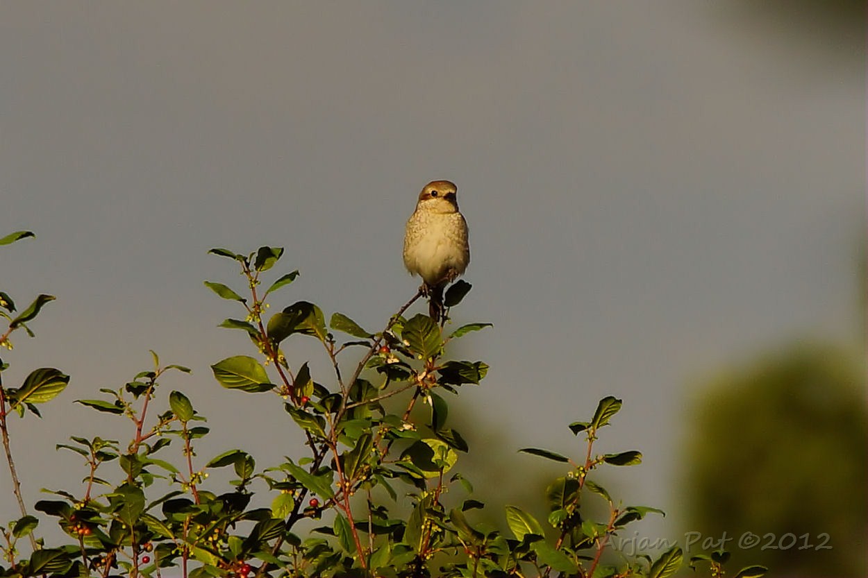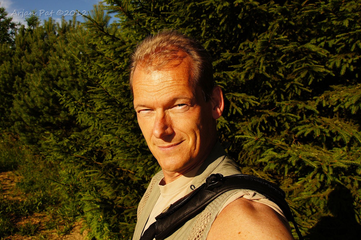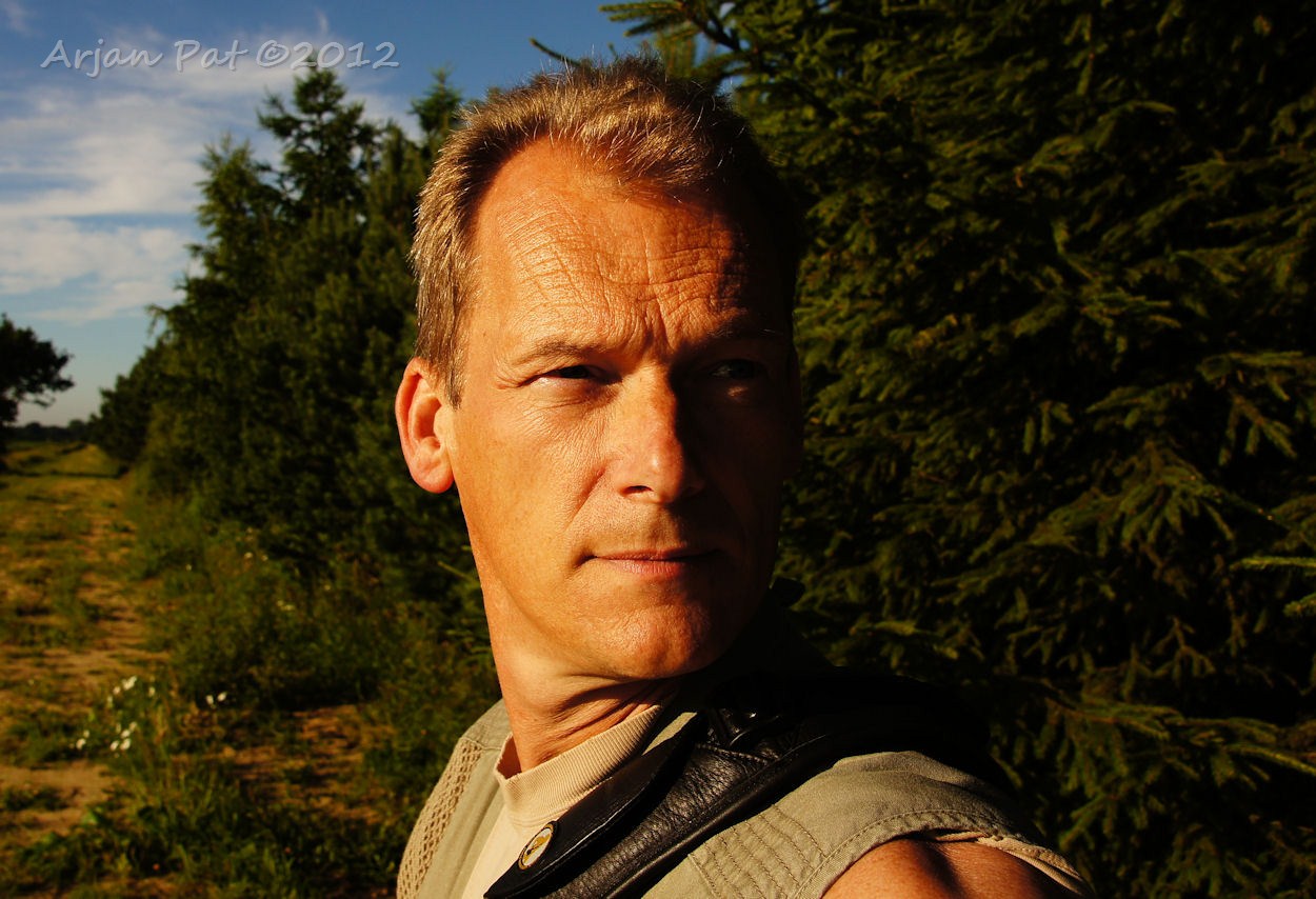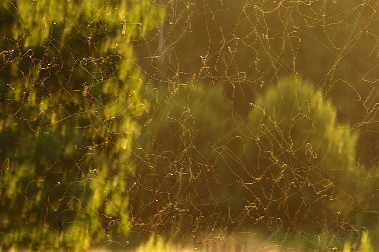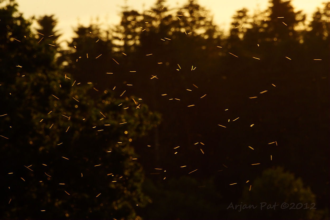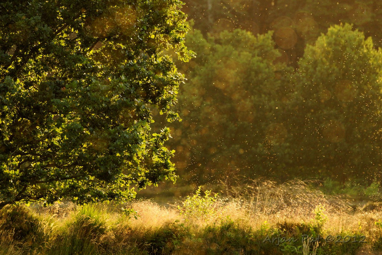 In de avond scheen de zon nog net over de bomen heen en verlichtte de rondvliegende insecten.