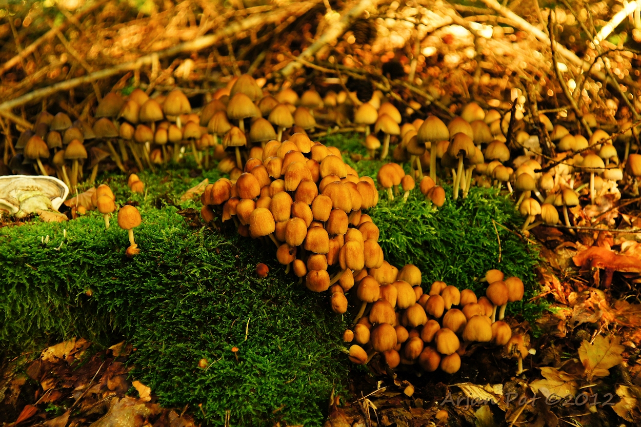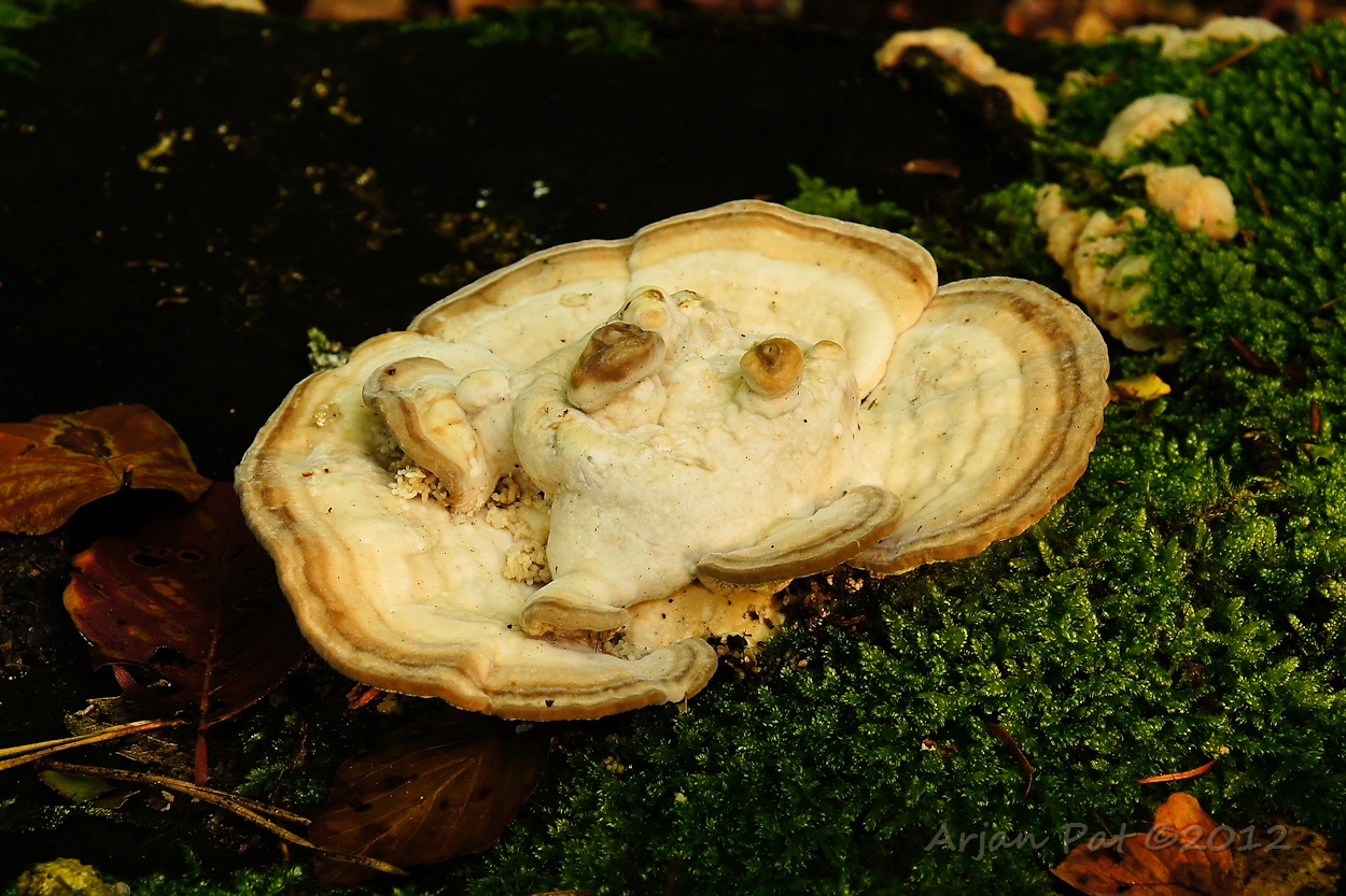 Oude boomstronk met bekermos en paddenstoelen.