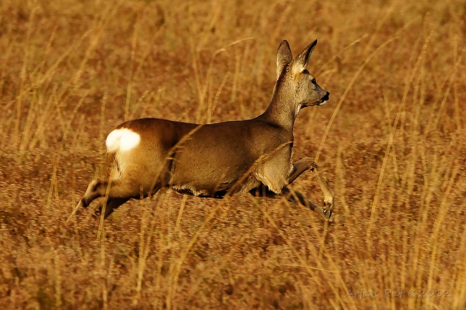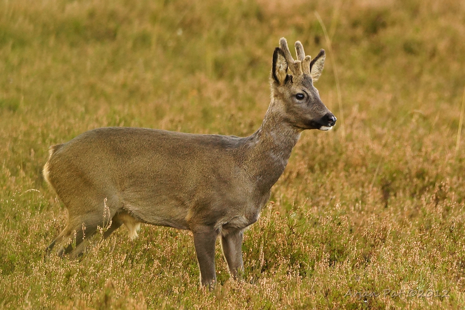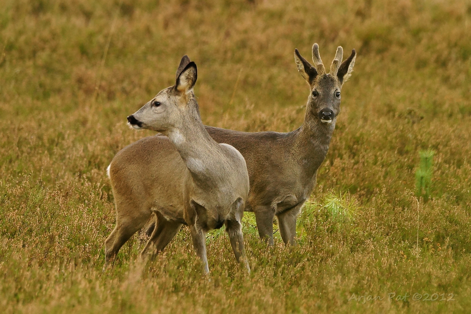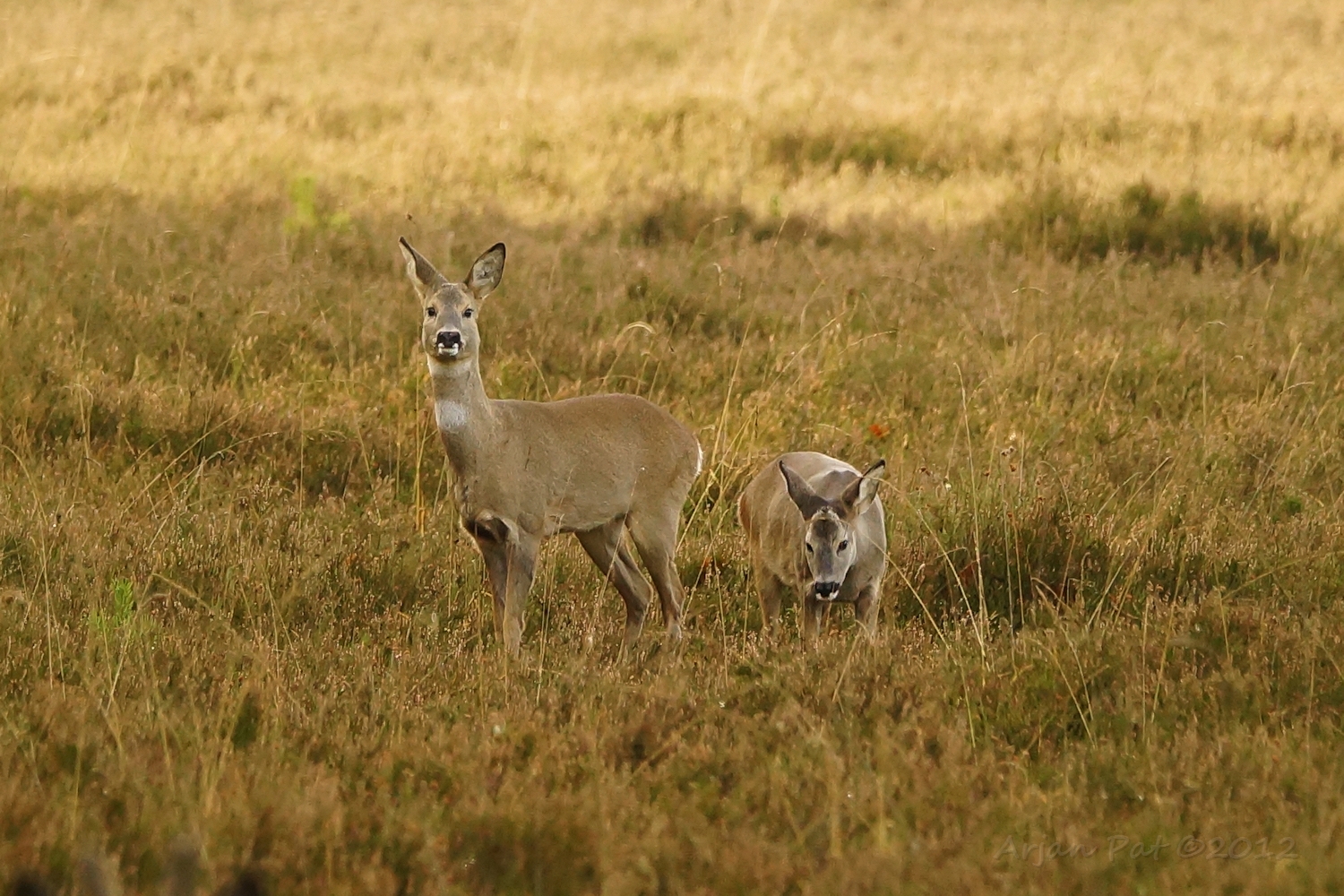 Een groepje van 5 reeën kwam mij toegesneld en bleef aan de rand van de hei staan. Bedachtzaam kijkend of ze veilig het bos in konden rennen. Dit stelletje (van uiteindelijk 3 stuks) hoorde blijkbaar mijn camera als eerste en bleef op zo'n 50-60 meter van mij staan.