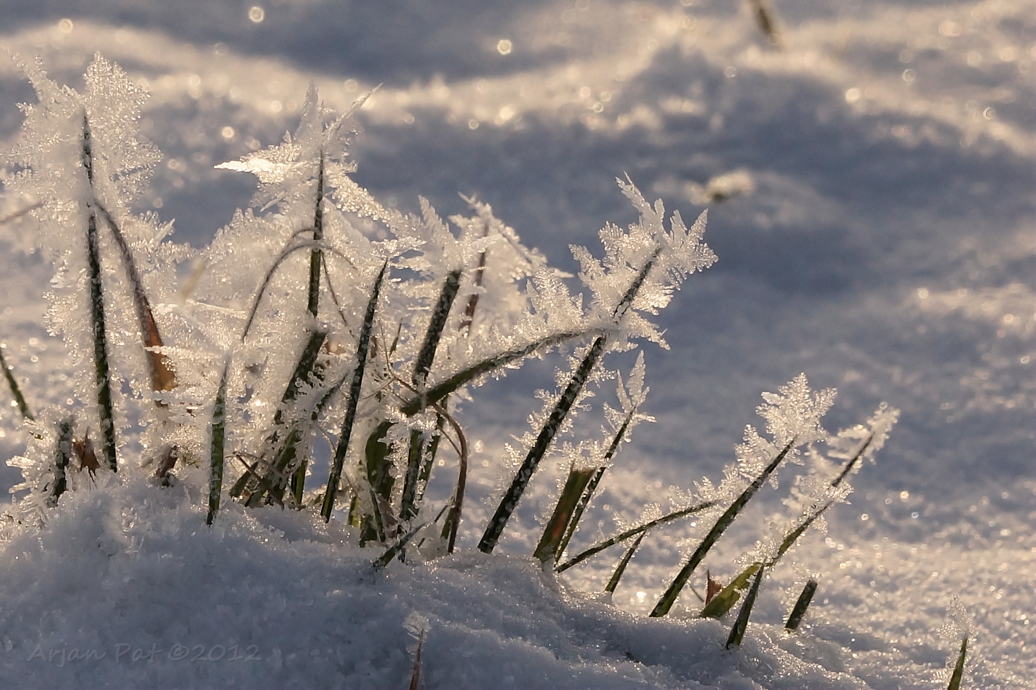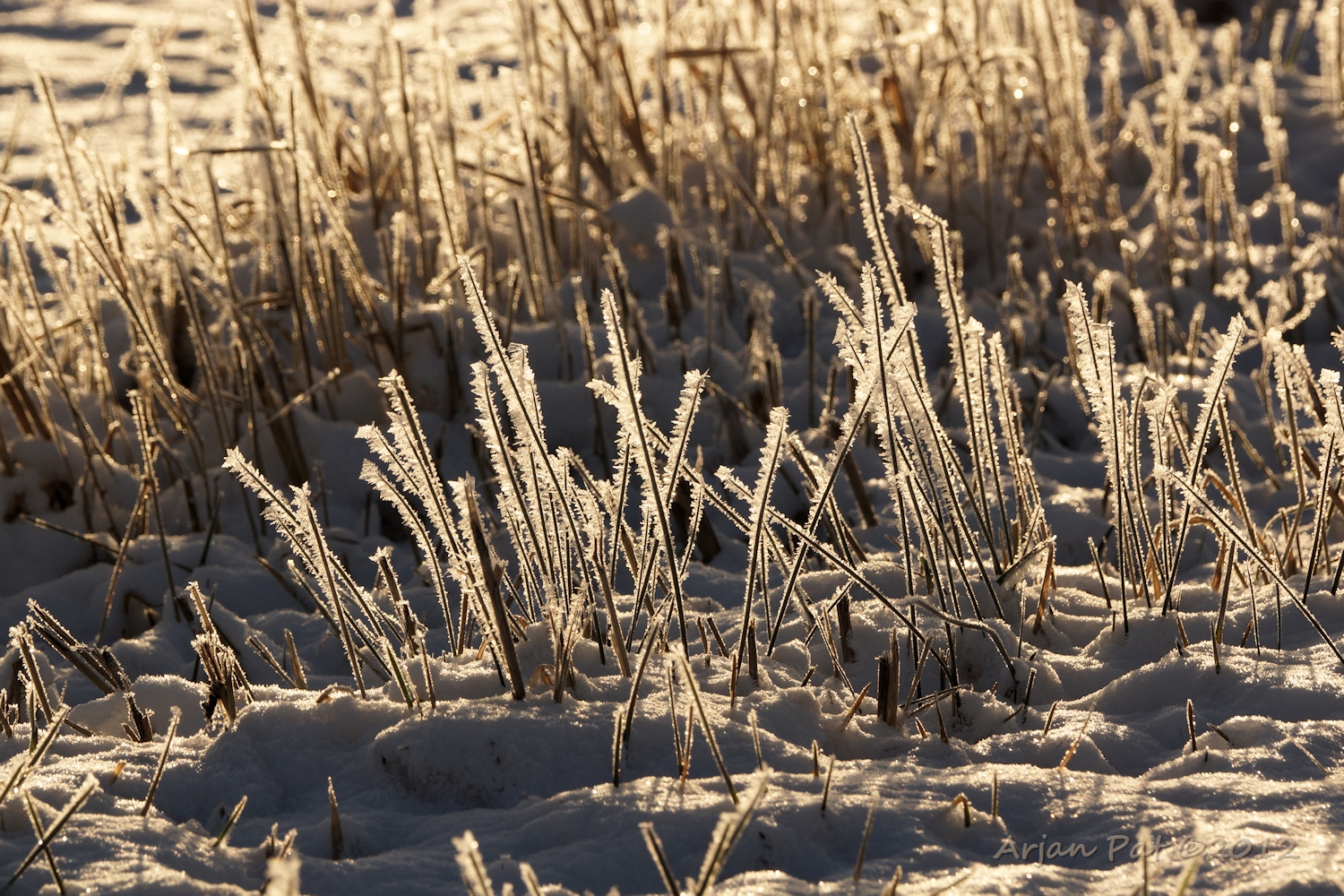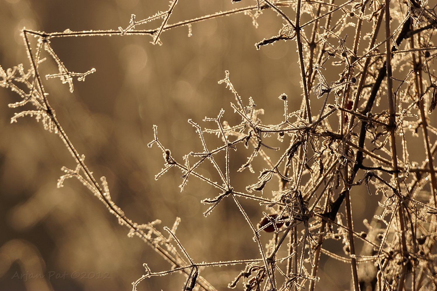 Rijp op de takjes van deze struik, zijn net kleine kristalletjes, als ze beschenen worden door de zon.