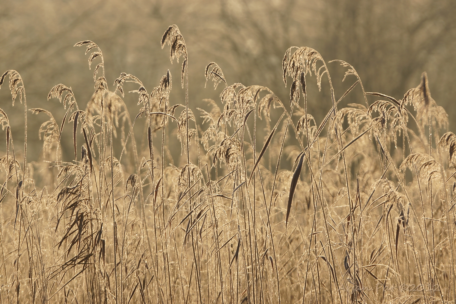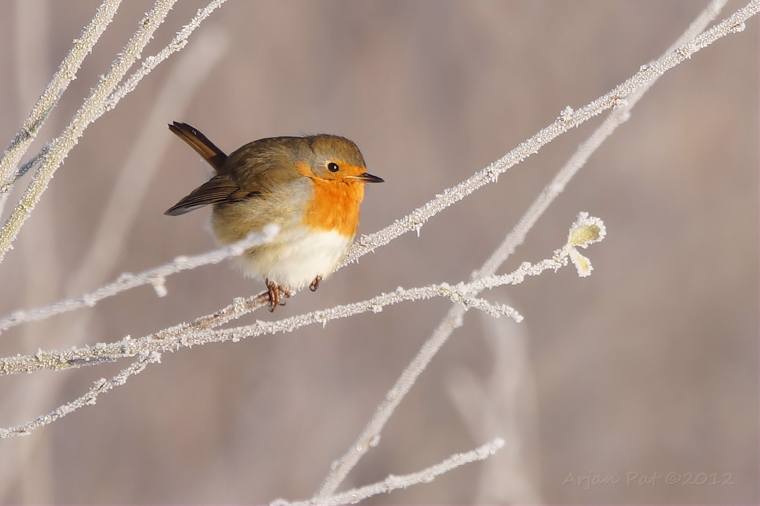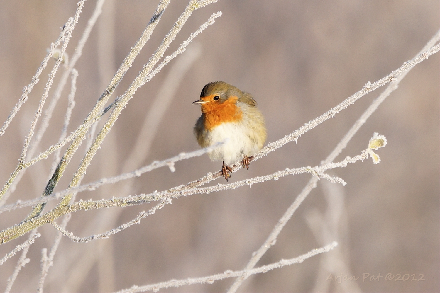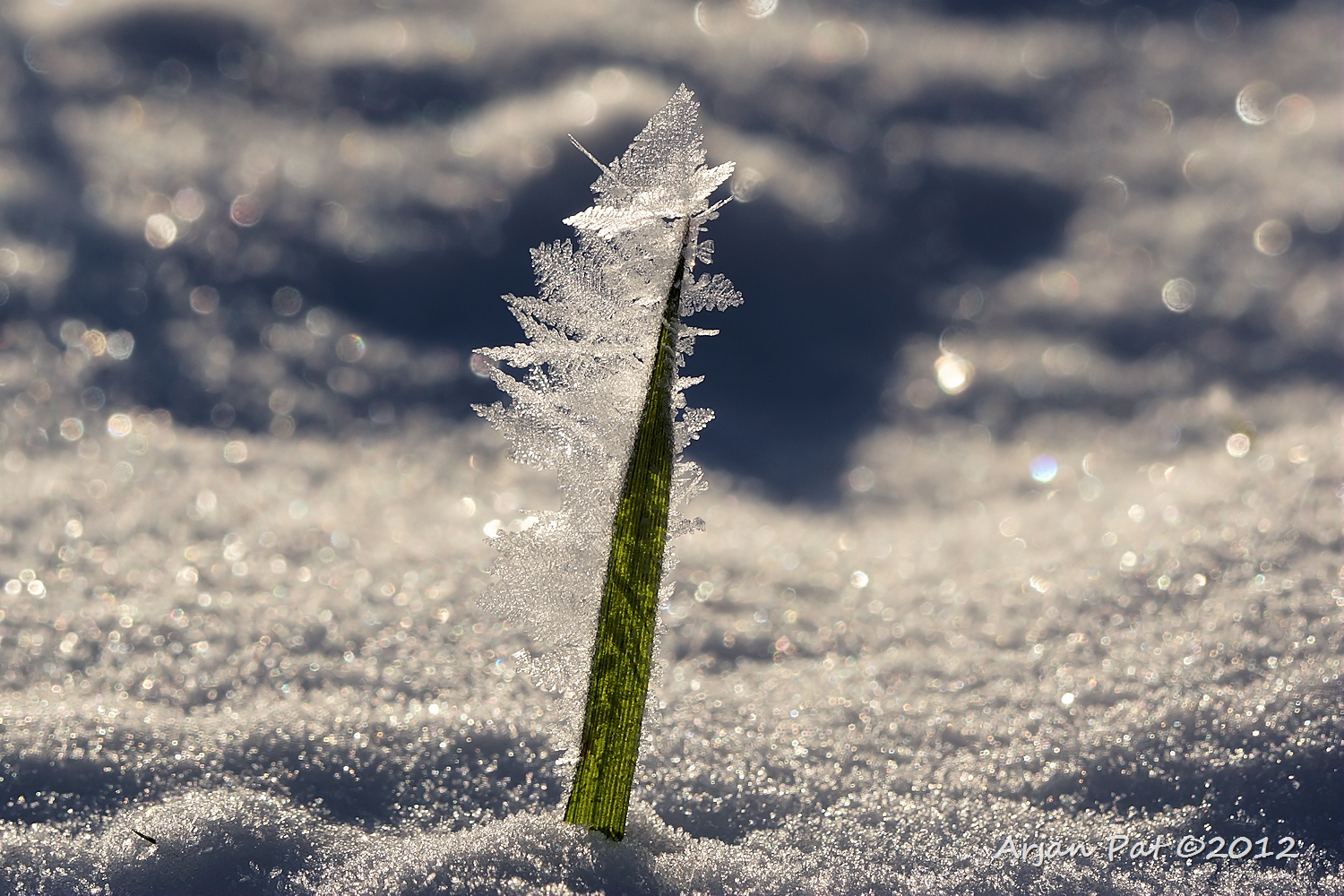 Rijp op de takjes van deze struik, zijn net kleine kristalletjes, als ze beschenen worden door de zon.